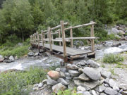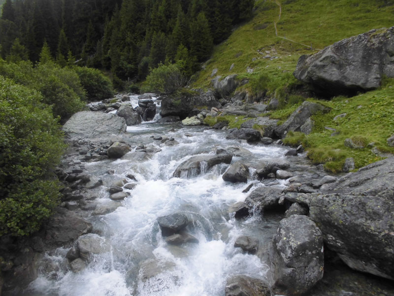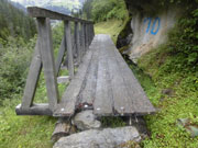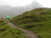 Schon bald kann ich durch die Bäume St. Anton am Arlberg erkennen. Das Ziel ist nahe. Schon fast hatte ich vergessen, dass noch ein ordentliches Stück Arbeit vor uns liegt. Nachdem ich mich geistig schon darauf eingestellt hatte, dass es nur noch bergab geht und ich von nun an entspannt ins Ziel laufen kann, wurde ich je gebremst. Ein Anstieg lag vor mir, der nicht zu enden schien. Stimmt, die Veranstalter hatten ja die Stecke geändert. Doch kurz bevor meine Oberschenkel streikten war ich oben und konnte mich an einer der letzten Versorgungsstationen laben. War`s das mit den Aufstiegen, fragte ich den Chefkellner, der mir einen Becher Cola reiche, doch der lächelte nur wissend und meinte, dass ich mich überraschen lassen soll. Nachdem ich einen weiteren Gebirgsbach dank einer Holzbrücke überquert hatte, ging es wieder schön bergab und ich konnte es auf einer leicht-Trail-angehauchten Stecke wieder laufen lassen.