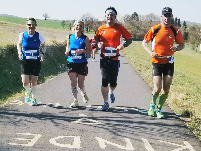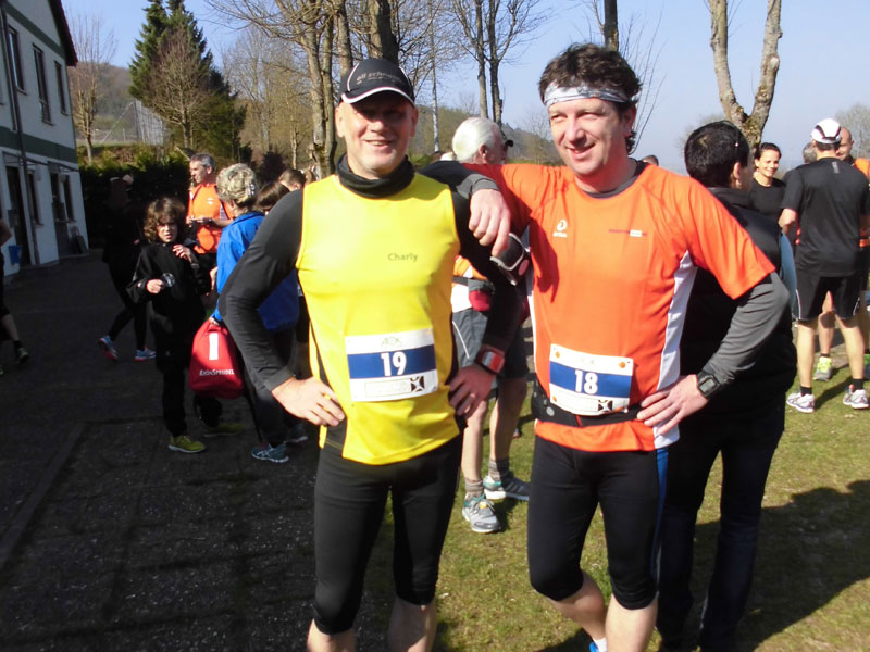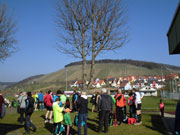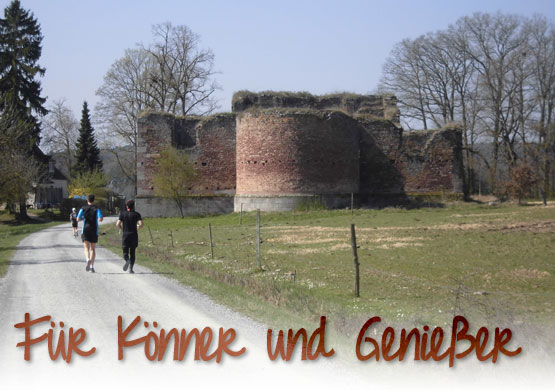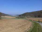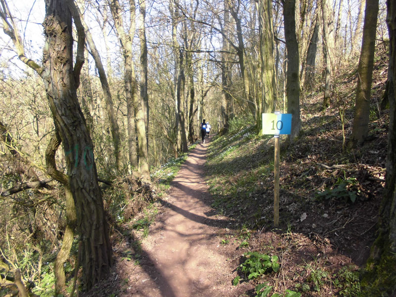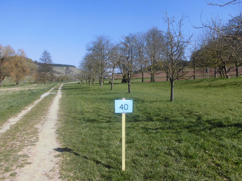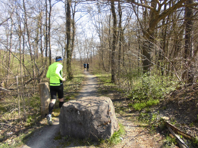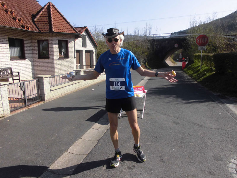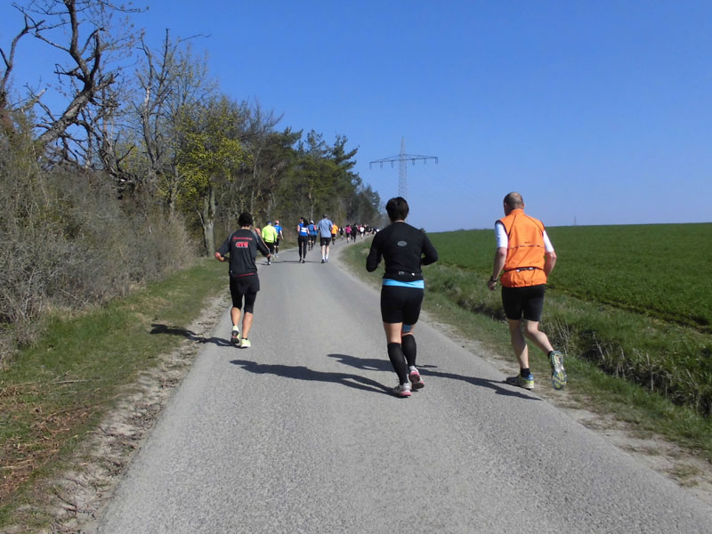 Nun haben wir einen wunderbaren Blick auf Aura an der Saale, das unterhalb von uns liegt. Dominant ist hier der Blick auf die Pfarrkirche St. Laurentius. Sie ist Teil einer ehemaligen Klosteranlage. Wir umlaufen die Klostermauern und nun geht es entlang der selbigen steil bergab. Das historische Pflaster ist nicht leicht zu belaufen. Hier heißt es Vorsicht walten zu lassen. Aura selbst ist ein sehr netter kleiner Ort, der mit seinen Fachwerkhäusern zu begeistern weiß, trotzdem lasse ich ihn schnell hinter mir. Am Ortsausgang geht es auf einem Trampelpfad unter einer Brücke durch und als wir am anderen Ende wieder auftauchen, stehen wir vor der Alten Brauerei, die sehr einladend aussieht. Davor ist ein Verpflegungstand aufgebaut, den ich dankend in Anspruch nehme. Es ist inzwischen warm geworden. Ich denke die 20 Grad Marke dürften wir geknackt haben. Im letzten Jahr konnte ich mehrfach hören, sind die Teilnehmer beinahe erfroren. Da hatte es nur 2 Grad und ein eisiger Wind machte das Ganze zur Tortur. Da will ich ja heute mal nicht maulen, auch wenn ich auf den kommenden Kilometern sicherlich das eine oder andere Schimpfwort auf den Lippen hatte. |