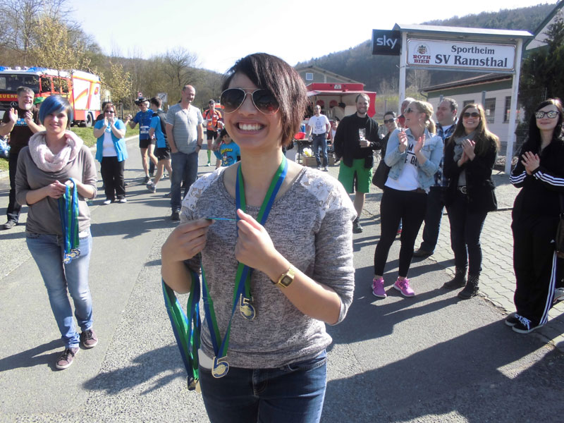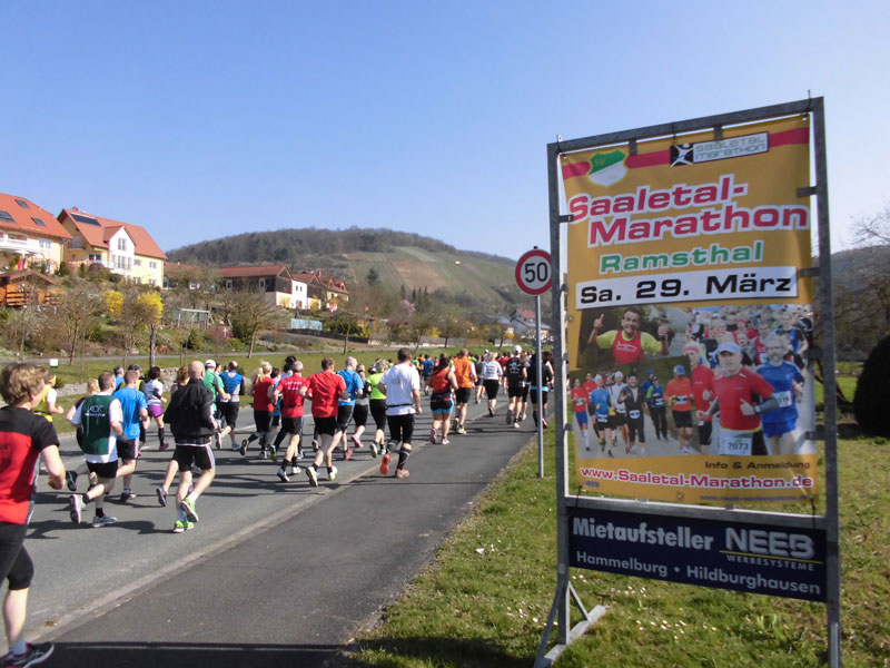 Mit ein paar Minuten Verspätung fiel dann aber der Startschuss zur fünften Auflage des Saaletal Marathons. Vom Sportzentrum liefen wie die Zufahrt runter zur Hauptstraße und dann gleich nach rechts in Richtung Ortszentrum, das wir auch schnell durchquert hatten. Jetzt hieß es für mich erst mal, dass ich mich richtig einsortieren muss. Nur nicht zu schnell. Die Halbmarathonis und 10-km-Läufer können schon mal dazu verleiten. Doch kontrollierende Blicke auf der Uhr bestätigten mir ziemlich schnell, dass ich den richtigen Schritt gefunden hatte. Am Ende von Ramsthal wartete eine Gruppe Zuschauer mit einem riesigen Plakat auf uns Läufer. „Auf geht`s! Der Berg ruft!“ stand dort geschrieben. Oje, das hatte ich in meiner ersten Euphorie ja ganz vergessen. Die nächsten vier Kilometer sollte es nur bergauf gehen. Es gab in der Ausschreibung zwar ein Streckenprofil, auf dem dies auch erkennbar war, allerdings ohne Angabe von den zu laufenden Höhenmetern. Ich hatte auf rund 500 Höhenmeter getippt und sollte am Ende auch recht behalten. Die ersten zu überwindenden Höhenmeter lagen nun vor uns. Hier sollte sich das Feld auch relativ schnell auseinander ziehen, da die ersten Läufer am Berg schon Probleme bekamen und diesen teilweise gehend bewältigten.
