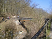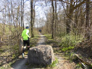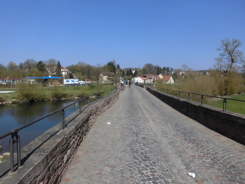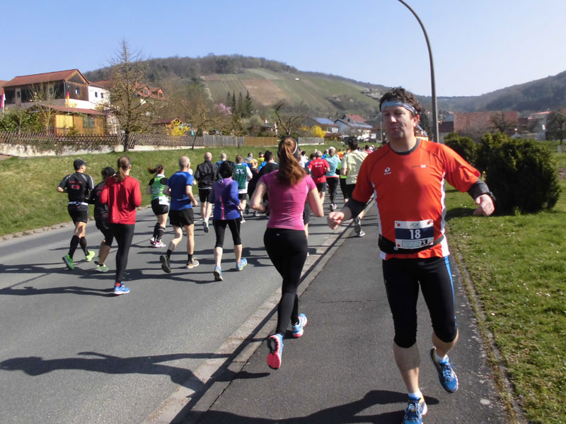 Oben angekommen konnten wir kurz eine tolle Aussicht genießen, bevor wieder durch ein schönes Waldgebiet laufen durften. Schon am Eingang des Waldes verließen uns die Kurzstreckler und wir teilten uns den weiteren Weg mit den Halbmarathonis. Immer wieder kam ich während des Laufens mit den überwiegend fränkischen Teilnehmern ins Gespräch, was die ganze Sache sehr kurzweilig machte. Doch eigentlich wären die Gespräche gar nicht notwendig gewesen. Was uns hier auf den ersten zwanzig Kilometern an Strecke geboten wurde, war ein reines Laufvergnügen. Auch von meinen Mitläufern hörte ich ausnahmslos lobende Worte. Herrliche Waldgebiete, tolle Aussichten, teilweise schön zu laufende Trails, idyllische Wege entlang der fränkischen Saale und dazu das frühlingshafte Wetter ließen die Zeit wie im Flug vergehen. Bis etwa Kilometer 18 laufen wir gemeinsam mit den Halbmarathonis. Danach erreichen wir Euerdorf, wo wir Marathonis nach rechts abbiegen dürfen. Wir überqueren die alte Saalebrücke, eine achtbogige Steinbrücke, deren älteste Teile aus dem 16. Jahrhundert stammen. Gemeinsam mit dem St.-Nepomuk Standbild aus dem Jahre 1713 kann ich zurück auf den letzten Kilometer blicken. Auch ein an der Stadtmauer rekonstruierter Wachturm zieht meinen Blick auf sich. Ist er doch nur zur Hälfte aufgebaut worden, so dass man wie bei einem Querschnitt den Blick ins Innenleben des Turms hat. Innerhalb der Stadtmauer liegt der historische Kern der netten kleinen Ortschaft, doch für eine Besichtigung habe ich leider keine Zeit, liegen doch noch rund 22 Kilometer vor mir.