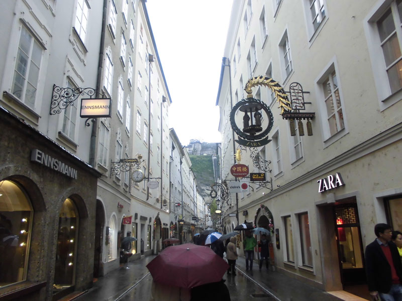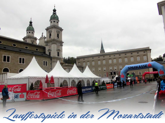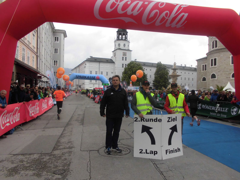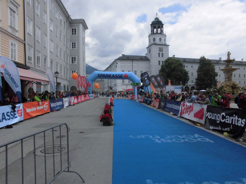 Nun geht es weiter in Richtung Kilometer 15 und die Stecke ist hier eher unspektakulär. Immer wieder geht mein Blick hoch zur Festung Hohensalzburg. Kurz spiele ich mit dem Gedanken, dass man dort doch im Rahmen eines Marathons auch mal hochlaufen könnte. Aber der Salzburg Marathon ist halt doch ein Stadtmarathon und es sollen ja ordentliche Zeiten gelaufen werden, so dass dies wohl eher abwegig ist. Bei Kilometer 17 laufen wir am Augustiner Kloster vorbei. Das Gebäude steht ebenfalls unter Denkmalschutz und ist eine alte Bierbrauerei. Früher verkauften Mönche hier das Bier an der Klosterpforte. Kurze Zeit später habe ich die Staatsbrücke über die Salzach vor Augen. Die Altstadt und das Ende der ersten Runde kommen näher. Wir lassen das Schloss Mirabell links liegen und es geht in die Altstadt. Die Läufer um mich verschärfen das Tempo etwas. Der überwiegende Teil setzt nun zum Endspurt an und ich lasse mich verleiten und ziehe mit. Leider dürfen wir die bekannte Getreidegasse mit ihren zahlreichen Geschäften und Cafés nicht durchlaufen. Da hätten wir wohl auch zu viele japanische Touristen verschreckt, die auch außerhalb der Getreidegasse zahlreich unterwegs sind. |