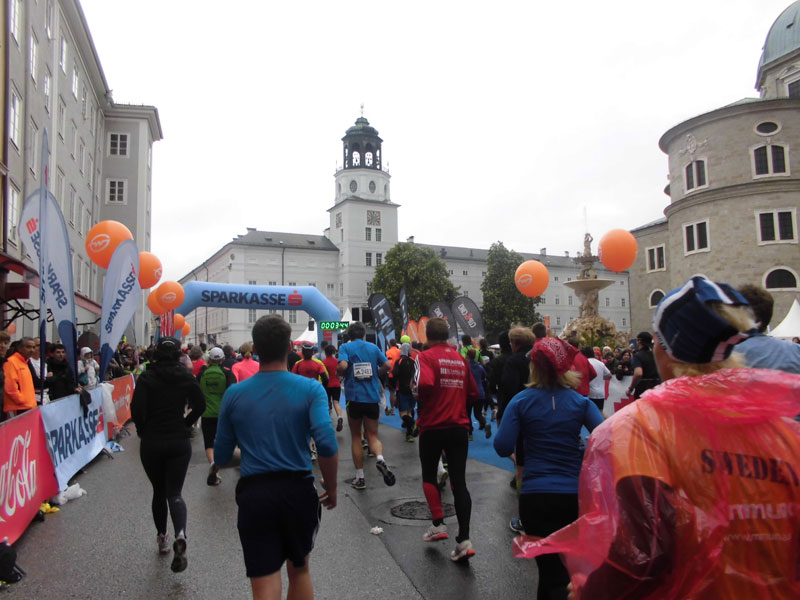 4:30 Stunden hatte ich mir heute vorgenommen. Keinen Stress und genießen. Und so war es auch schon 9:03 Uhr bis ich die Startlinie überqueren durfte. Einen besseren Platz hätten sich die Organisatoren für den Marathon wirklich nicht aussuchen können. Der Platz wird im Westen von der Alten Residenz, im Osten von der Neuen Residenz, sowie dem Dom im Süden eingerahmt. Auch der Residenzbrunnen mitten auf dem Platz fügt sich herrlich in das Bild ein. Die vielen Zuschauer, die uns zujubeln, lassen durchaus schon zu so einem frühen Zeitpunkt des Marathons Gänsehautfeeling aufkommen, wobei ich gar nicht daran denken muss, das sich der Residenzplatz an der Stelle eines früheren Friedhofs befindet.