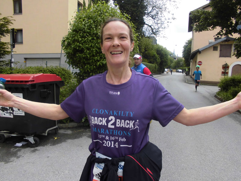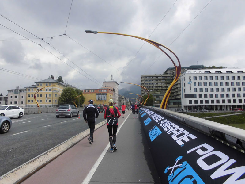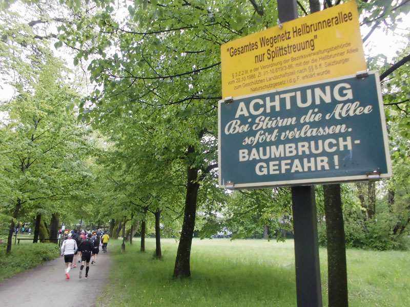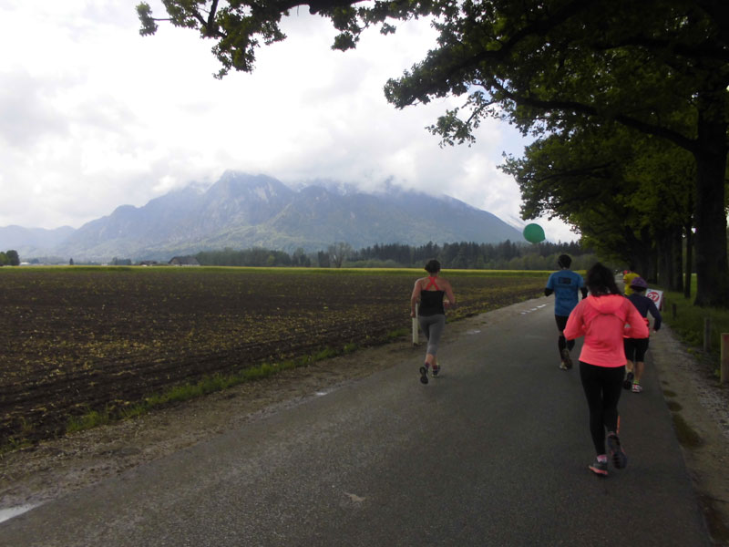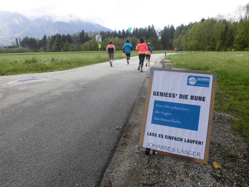 Ab nun hieß es „Follow the Green Steps“. Unter diesem Motto finden wir in diesem Jahr die Bodenmarkierungen entlang der Marathonstrecke. Ein grüner Fußabdruck soll uns den Weg zum Ziel, aber auch zu einem nachhaltigen Lebensweg weisen. Naja, ob ich dazu einen Marathon brauche, ich weiß es nicht, ich muss aber auch nicht nach den Spuren suchen, ich laufe einfach den anderen hinterher. Etwas an der Salzach entlang, geht‘s bald raus aus Salzburg. Ich versuche erst mal einen Lauf-Rhythmus zu entwickeln und mein Tempo anzupassen. Nach einem Kilometer habe ich wieder warme Hände und auch mein Lauftempo war in Ordnung. Rund 3.500 Läufer aus 60 Ländern haben sich mit mir auf den Weg gemacht. Etwa 2.500 werden schon nach der ersten Runde ihr Ziel erreicht haben.