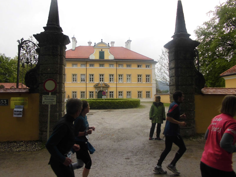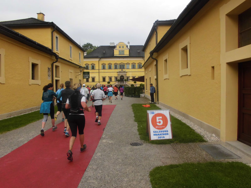 Schloss Hellbrunn ist ein im frühen 17. Jahrhundert angelegtes Lustschloss, das sich im Stadtteil Morzg befindet. Es ist bekannt für seine Wasserspiele und steht zusammen mit den dazugehörigen Parkanlagen unter Denkmalschutz. Über einen roten Teppich laufen wir über eine letzte kurze Allee auf das Schloss zu, wo wir nach fünf Kilometern auch die erste Verpflegungsstation erreichen. Ein junges Paar zeigt hier auch eine Aufführung, die wohl eine akrobatische Mischung aus Tanz und Kampf ist. Sieht interessant aus, über den genaueren Sinn kann ich die beiden jedoch nicht befragen, ich will ja weiter.