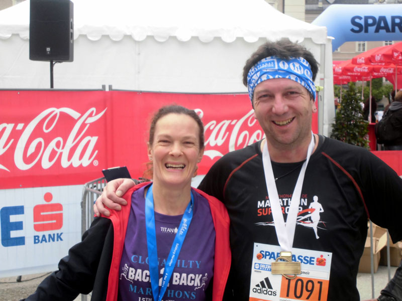 Pünktlich machten wir uns schließlich auf den Weg zum Residenzplatz. Meine Jacke behielt ich so lange an wie nur irgendwie möglich, es war lausig kalt, aber es hatte zu regnen aufgehört. Rund eine viertel Stunde vor dem Start gab ich dann doch meine Tüte an dem für mich vorgesehenen Lkw ab und traf dort auch noch auf Andreas Bettingen vom Marathon4you-Team. Wir hatten uns schon im Vorjahr in Liechtenstein kennengelernt. Nachdem wir uns kurz ausgetauscht hatten, machte ich mich auf den Weg in den hinteren Startblock.