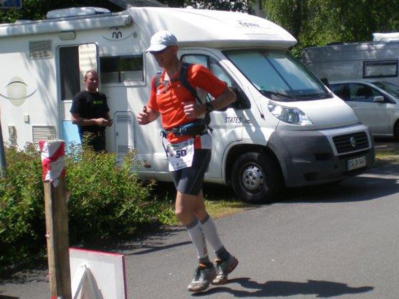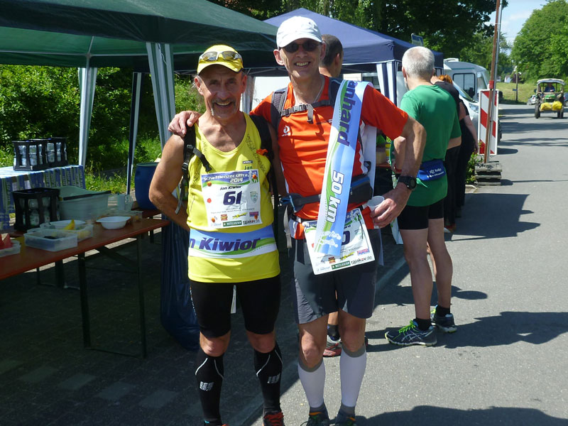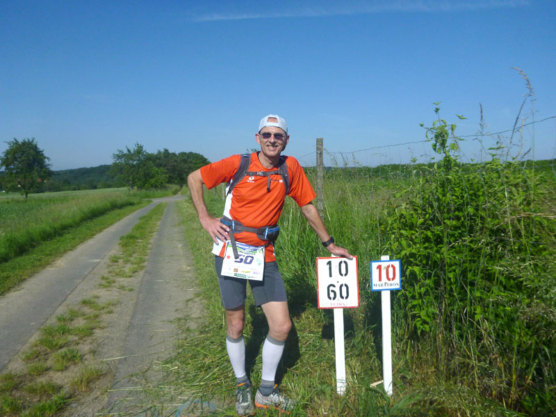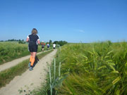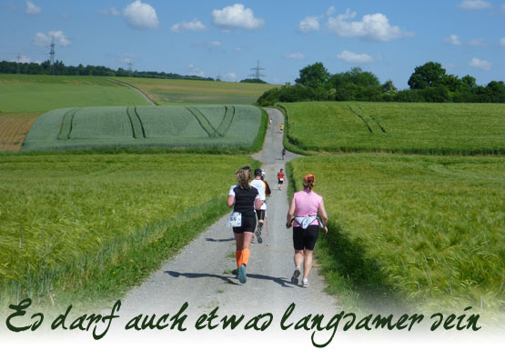 Ausnehmend gut meint es heute das Wetter mit uns, bei längeren wolkenfreien Abschnitten werden schon mal 25 Grad erreicht. Nur mehr wenige Streckenteile führen im letzten Drittel des Laufes über Naturwege, meist bewegen wir uns auf kleinen Nebenstrecken oder Radwegen über Asphalt. Einzig ein längeres Waldstück um km 40 bietet noch Abwechslung in der Wegbeschaffenheit. So nach und nach kann ich einige vor mir liegende noch einsammeln. Nur Bernd Rohrmann fühlt sich durch meinen Überholvorgang motiviert, nimmt wieder richtiges Lauftempo auf und setzt sich wieder vor mich.
