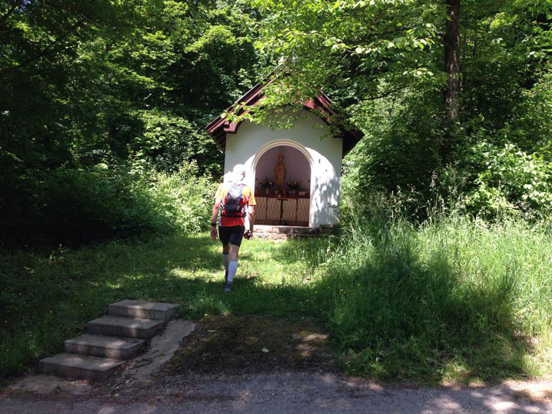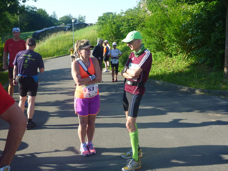 Über Felder und Wiesen erreichen wir Sulzbach, zur Abwechslung durchqueren wir einmal fast den kompletten Ort. Mittendrin, neben einem idyllischen Weiher liegt der nächste Verpflegungs- und Kontrollposten (Km 23). An jeder Station wird auch die Startnummer notiert, damit keiner verloren geht. Knabbereien und Getränke werden angeboten.