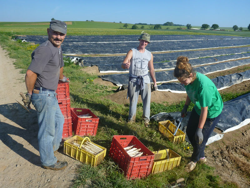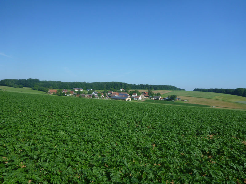 Die Streckenabschnitte ähneln sich jetzt etwas, Felder, Wiesen und kleine Waldabschnitte wechseln sich ab und es ist bleibt durchgängig hügelig. Nach einem längeren Abwärtsstück treffen wir in Billigheim ein. Die VP ist direkt am Ortsbeginn und in der Werkstatt des hiesigen Autohändlers untergebracht. Das Angebot ist wieder so verlockend, dass man am Ende des Tages sicher einer positiven Kalorienbilanz kaum entgehen kann.