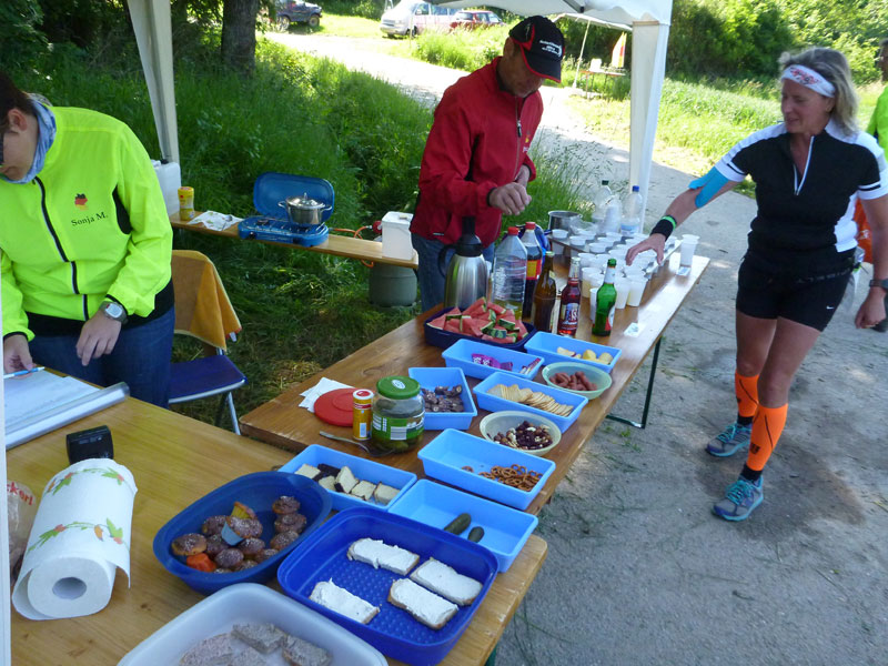 Auf einem großen Hinweisschild wird uns schon die gigantische Brotzeitoase (Km 19) angekündigt. Und das Schild verspricht nicht zu viel. Schmalz- und Frischkäsebrote, Würstchen, Essiggurken, Kuchen, Salziges, Süßes, Obst, Cola, Iso, Bier und noch einiges mehr stehen im Angebot. Man merkt, Organisator Gerhard Eisner ist selbst Ultraläufer, der weiß genau nach was einem auf langen Strecken so gelüstet. Wir verweilen eine geraume Zeit an der Station, so sammeln sich einige der Nachzügler am Verpflegungsposten.
