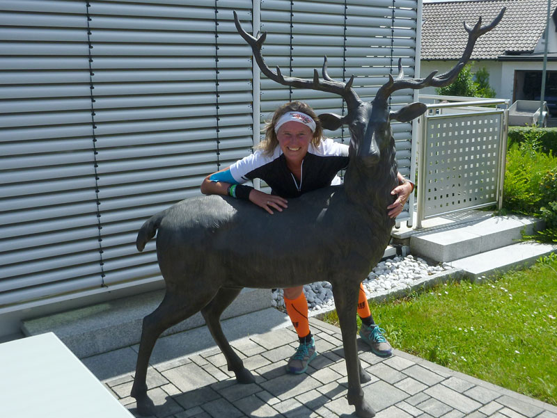 Bergauf schlängeln wir uns am Ortsrand durch Billigheim. Eine nette optische Abwechslung bieten uns große Wildtierplastiken vor einem Wohnhaus. Über zwei Kilometer führt uns eine schmale Teerstraße durch ein Waldgebiet. Richtig was auf die Ohren bekommen wir nach 32 Kilometern am VP in Katzental geboten. Heavy Metal Freaks bewirten die Station, zur Verpflegung haben sie Schwermetal aufgelegt. Ich möchte jetzt einen Zahn zulegen, alles läuft rund und beschwerdefrei, so setzte ich mich alleine nach vorne ab.