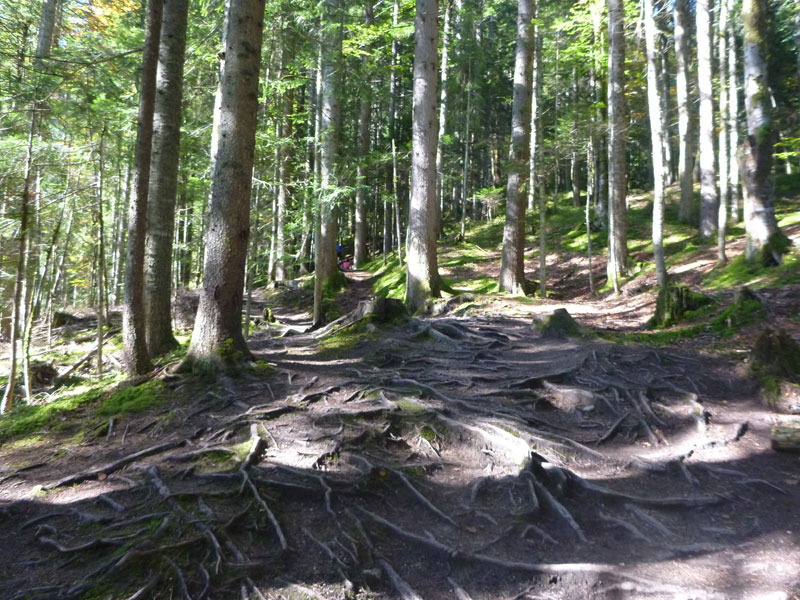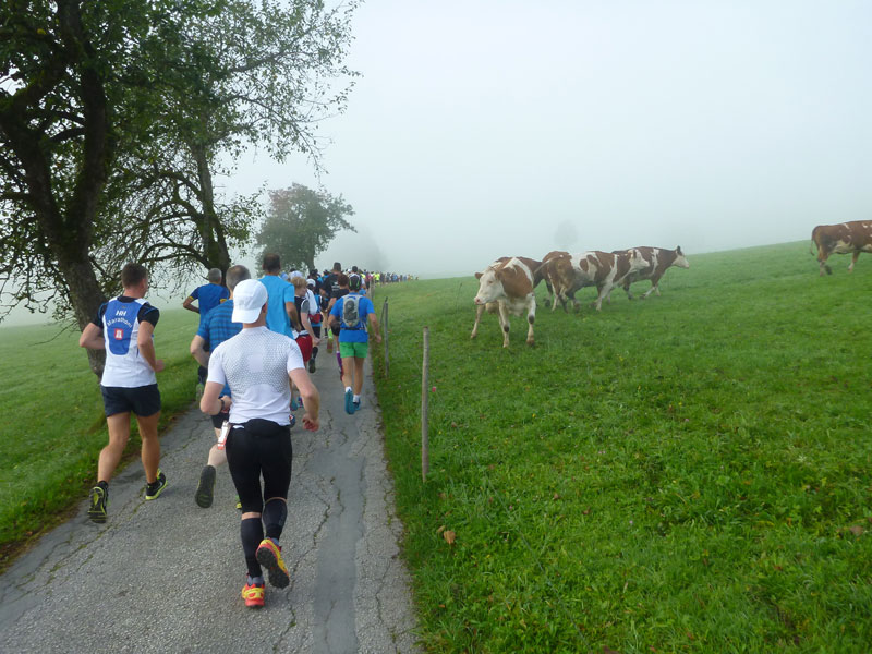 Mit schnellem Wanderschritt ist das nicht zu erreichen, wir müssen ab hier zügig laufen. Das fördert die Adrenalinausschüttung. Anfangs habe ich noch größte Schwierigkeiten, aber glücklicherweise wird das Gefälle bald angenehmer und die blockierten Oberschenkel lösen sich wieder etwas. Auch die Wade hält einigermaßen ruhig und die Adduktoren haben aufgegeben. Aber wir müssen dran bleiben. In langen flachen Serpentinen über Schotterstraßen führt uns die Strecke zum Filzbodensee (km 5). Das Gefälle ist gut zu bewältigen. Aber es wird trotzdem eng das Zeitlimit von 5:15 h am Hexenwasser einzuhalten. Einige hundert Meter geht es wieder leicht aufwärts, das kostet Zeit. Dirk ist besser drauf, macht sich vom Acker.