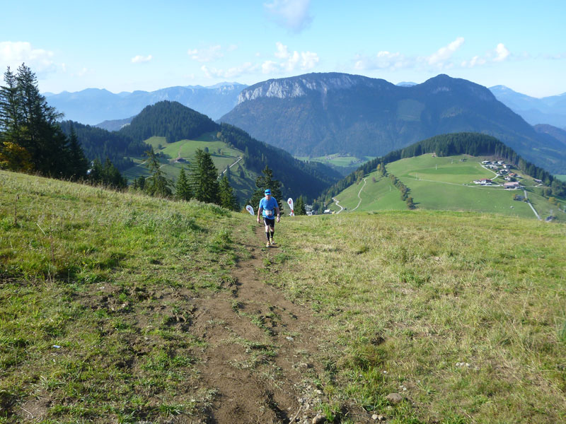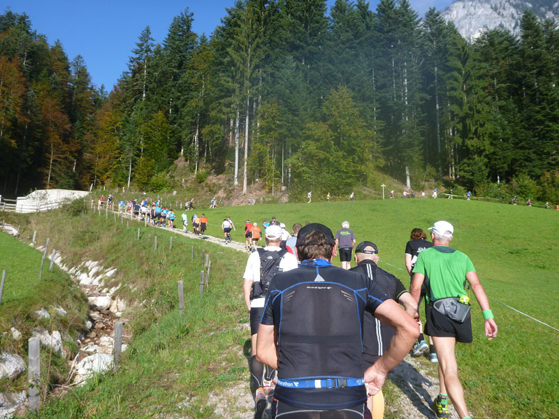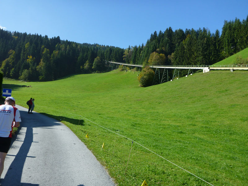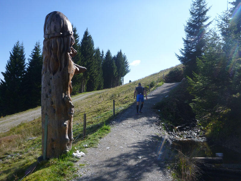 Noch etwa einen Kilometer geht es zwar steil, aber relativ komfortabel auf einer Schotterstraße weiter. Dann biegen wir ab auf die „schwarze Abfahrt“ unter der Gondelbahn und es geht erst einmal kerzengerade streng nach oben, ohne irgendeine Windung. Bei km 41 hat man nochmals eine Erfrischungsstation errichtet. Von hier zweigt die Strecke mehr nach rechts ab, wir laufen in einem Bogen Richtung Ziel.