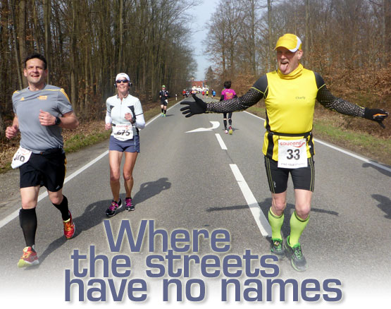 Nach Kandel geht es über eine kurze Landstraße rein in den Bienwald. Bis Kilometer 18 werden wir nun einer breiten Straße durch den Wald folgen, um am Ende in der Ortschaft Schaidt wieder zu wenden. Die Halbmarthonis wenden schon kurz nach 13 Kilometer und es wird deutlich ruhiger. Nun kommen auch erste Gespräche mit den Mitläufern zustande. So schließe ich auf Birgit auf und wir begleiten uns ein paar Kilometer, bis sie mich weiterschickt. Sie findet ich sei ihr zu schnell. Das hat noch nicht oft jemand zu mir gesagt, aber ich entspreche ihren Wünschen und laufe weiter. In Schaidt begrüßt uns eine Blaskappelle und macht Stimmung. Nach dem Wendepunkt kommen wir nochmals in den Genuss den Melodien der Blaskapelle zu lauschen. Kurz danach entdecke ich ein Plakat mit der Aufschrift „Könnten Sie jetzt noch bremsen?“ am Straßenrand. Es soll die Verkehrsteilnehmer auf die Gefahren des Wildwechsels im Bienwald hinweisen. Ich halte natürlich kurz an, zücke meine Kamera und will das Plakat fotografieren. Passt doch auch für uns Marathonis. In diesem Moment stimmt die Kapelle hinter mir Helene Fischers „Atemlos durch die Nacht“ an und ich denk mir: „Nein, jetzt kann ich nicht mehr bremsen!“ Nichts wie weg hier. Schnell verklingen im Wald die letzten Töne und ich habe wieder meine Ruhe.