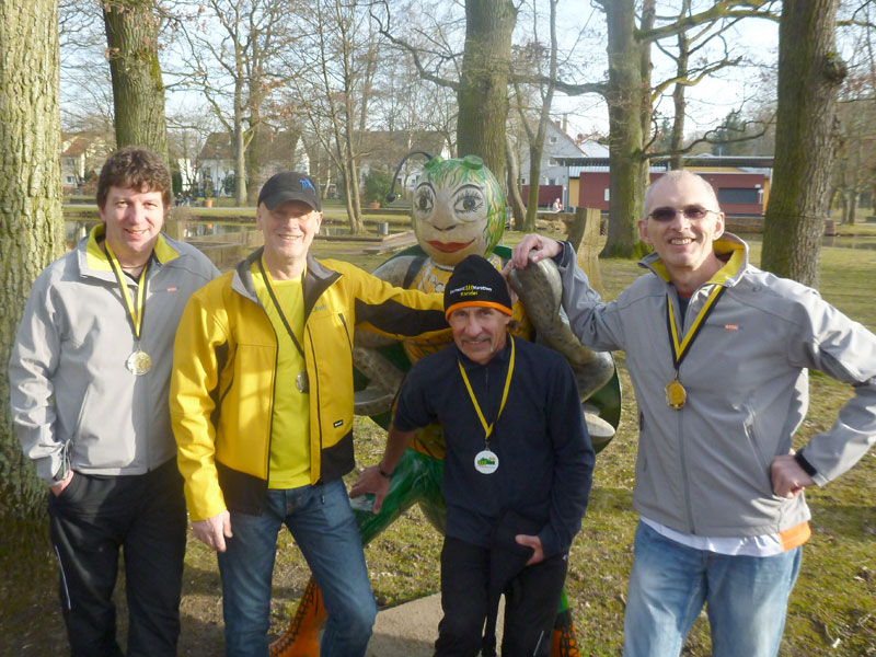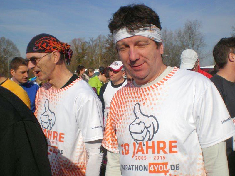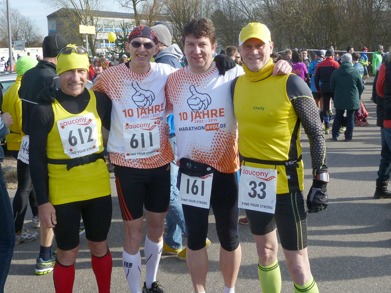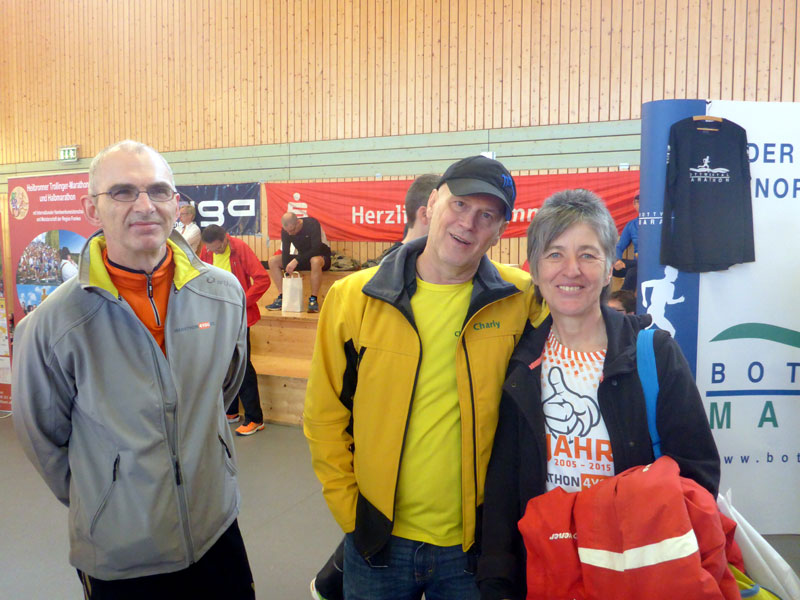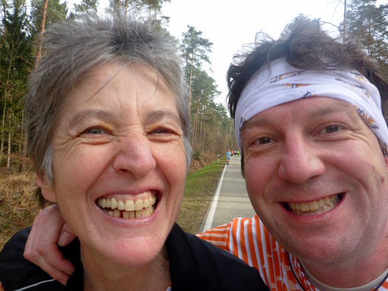 Nach einer ausgiebigen Dusche kommen wir gerade noch rechtzeitig zur Siegerehrung und können uns auch noch stärken. Das Angebot ist sehr gut und ich überlege mir noch kurz es mit der örtlichen Spezialität dem Pfälzer Saumagen zu probieren. Den hatte mir Klaus schon im vergangenen Jahr ans Herz gelegt. Aber einen Saumagen habe ich gerade selber und entscheide mich anders. Doch eine „Heiße Wurst im Brötchen“ bringe ich als Bayer dann halt doch nicht über die Lippen. Da es sich ja hier um einen Internationalen Marathon handelt, hat die die nette Dame an der Essensausgabe auch kein Problem, als ich „a Würstl mit Semmel“ bestelle. Frisch gestärkt verabschieden wir uns etwa eine halbe Stunde später von unseren alten und auch neuen Lauffreunden und machen uns auf den Heimweg. Ein toller gemeinsamer Marathontag liegt hinter uns und wir freuen uns alle schon auf ein Wiedersehen, vielleicht ja auch nächstes Jahr in Kandel.