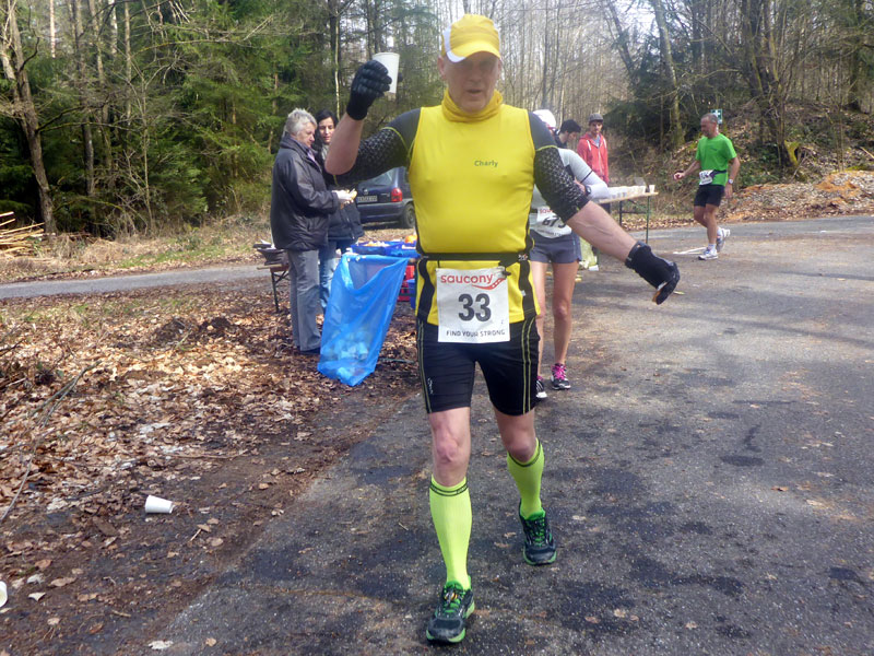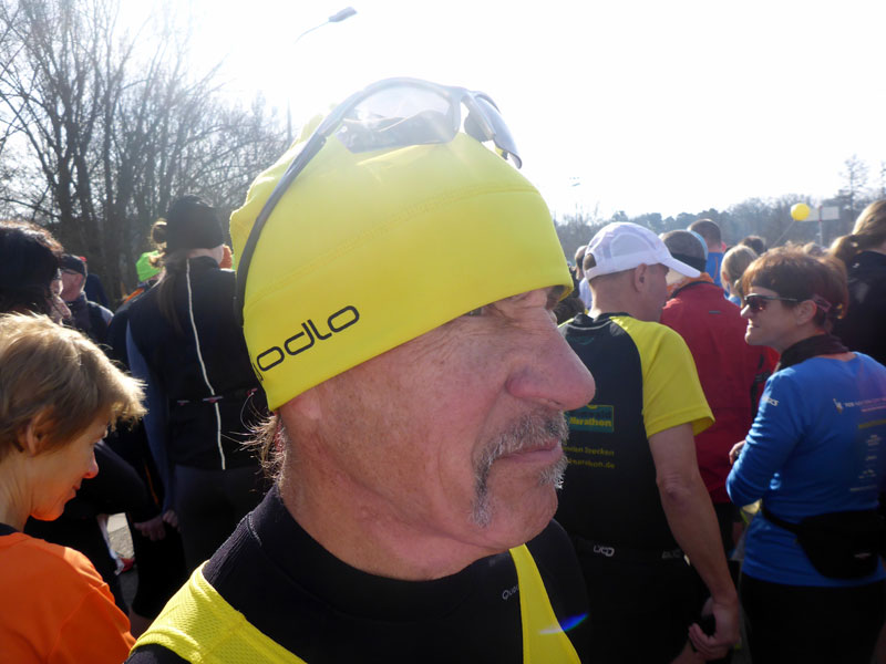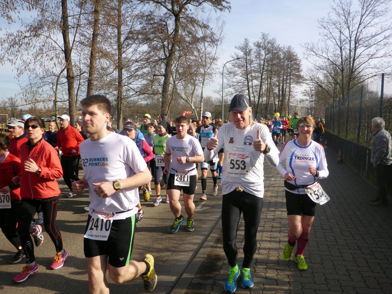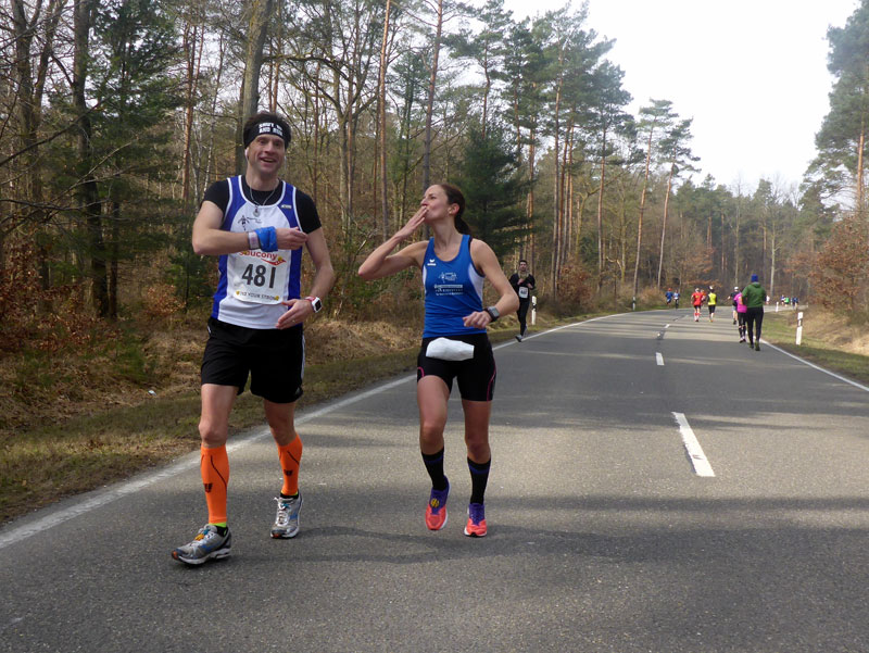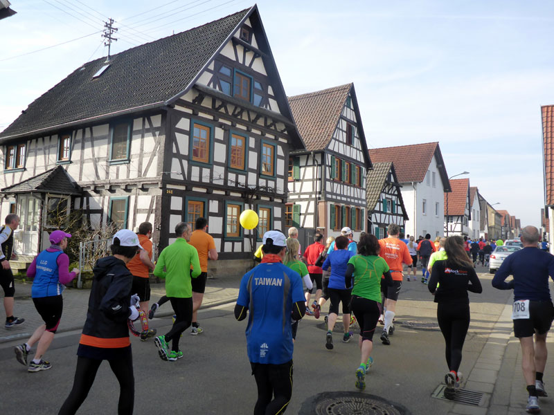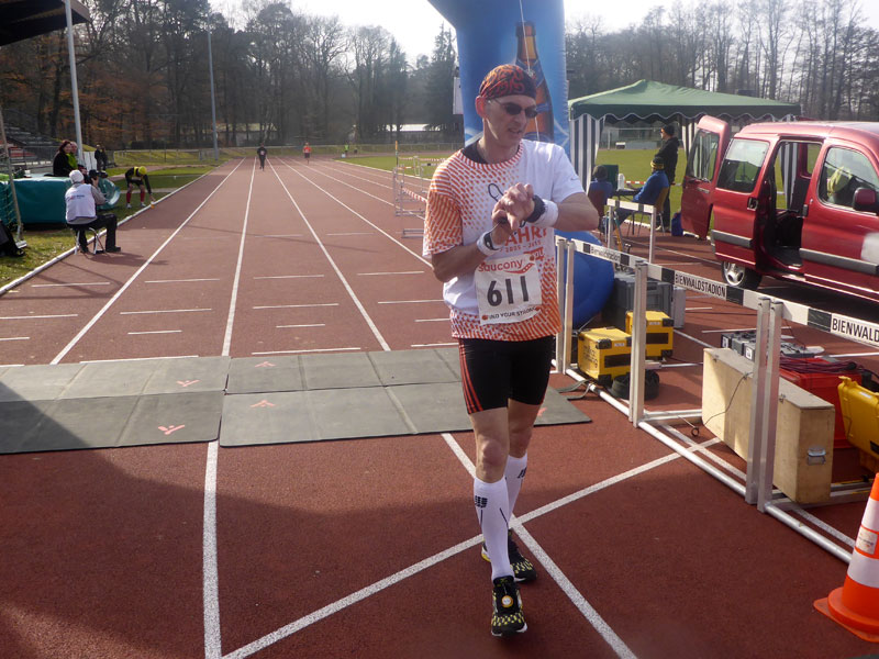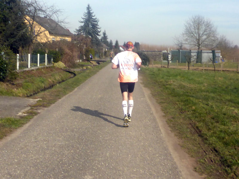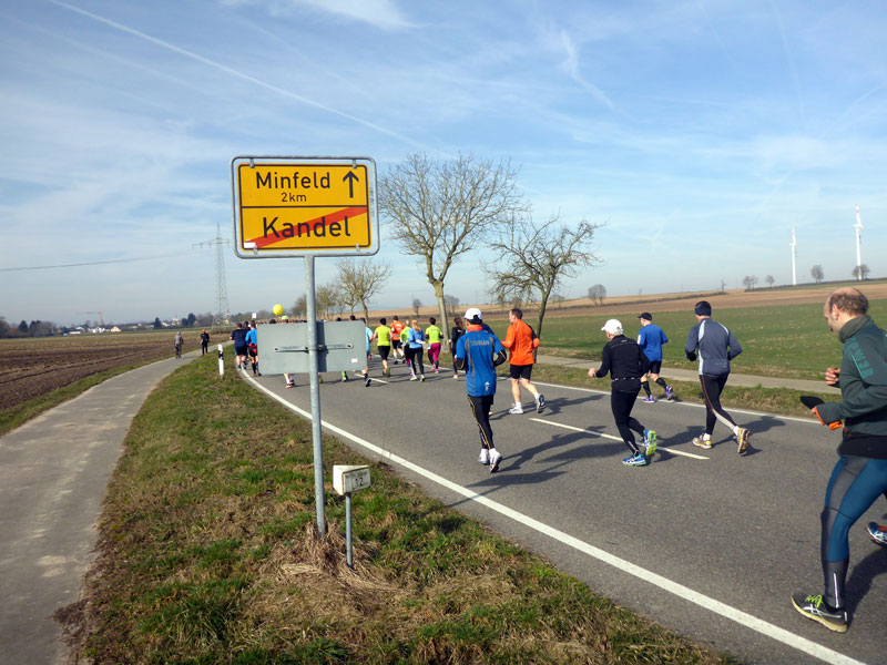 Nun nehme ich mir Läufer für Läufer vor und mache so den ein oder anderen Platz gut. Man braucht nun Ziele, schließlich bin ich schon bei Kilometer 30 angekommen und vor mir liegt diese endlose Bundesstraße. Ab und an muss ich schon beißen, verliere aber nicht an Tempo und hole weiter auf. Irgendwann habe ich aber doch das Ende dieses Abschnitts erreicht und biege nach links in Richtung Naturkundehaus ab. Der Kopf sagt mir, dass es nun bald vorbei ist, obwohl schon noch ein paar Kilometer vor mir liegen. Kurz nach der Verpflegungsstation am Naturkundehaus entdecke ich Bernie ein paar hundert Meter vor mir und ich habe ein neues Ziel. Ich laufe jetzt einen Schnitt von deutlich unter Sechs und hole merklich auf Bernie auf. Kurz vor Kandel biegen wir schließlich auf einen kleinen Fußweg ab, wo uns zahlreiche Spaziergänger entgegenkommen, die das fast schon frühlingshafte Wetter genießen und Bernie ist in Griffweite. Ich tippe ihm auf die Schulter, Bernie scheint auch schon etwas zu kämpfen. Flache Straßenläufe sind halt einfach nicht mehr sein Ding. So überhole ich Bernie und kann auch schon bald den Sprecher im Stadion hören. Kurz bevor ich ins Stadion einbiegen und eine letzte Runde auf der Tartanbahn des Bienwald-Stadions laufen darf, meldet sich mein Magen und gibt mir zu verstehen, dass das Tempo, das ich nun laufe, so gar nicht seinen Vorstellungen enstprechen und ich nehme etwas heraus.