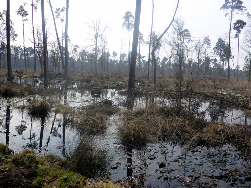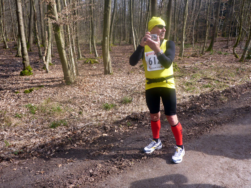 Ich stecke meine Kamera jetzt mal weg, denn nun geht es ein paar Kilometer zurück in Richtung Kandel, bevor wir nach rechts abbiegen dürfen, um noch tiefer in den Bienwald einzutauchen. Auf diesem Streckenabschnitt kommen mir die schnelleren Läufer auch schon wieder entgegen. Ich freu mich, kann ich doch wieder mit dem ein oder anderen Bekannten abklatschen und freu mich besonders, dass einige von ihnen wirklich fantastisch schnell unterwegs sind. Nur noch selten nehm ich nun meine Kamera, die Läufer werden immer weniger und trotz der tollen Landschaft gibt es halt einfach nur Bäume. Damit habe ich auch mal wieder Zeit, um auf meine Uhr zu schauen. Ich bin im Plan, die 4:30 sollten sich ausgehen. Ein Blick über die Schulter bestätigt mir dies, der Pacer für die 4:30 ist knapp hinter mir. Ich will aber nicht mit einem Pacer laufen und lege noch eine kleine Schippe drauf. Bald hab ich sie abgehängt und komme wieder zurück auf die Bundesstraße, biege nach rechts ab und laufe nun wieder in Richtung Kandel.