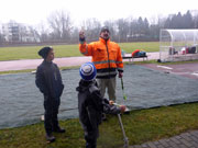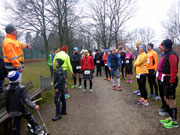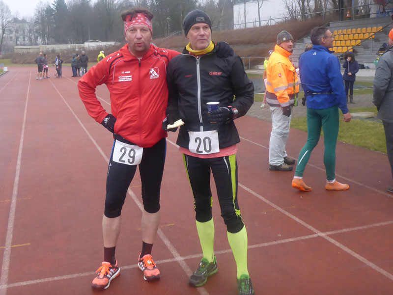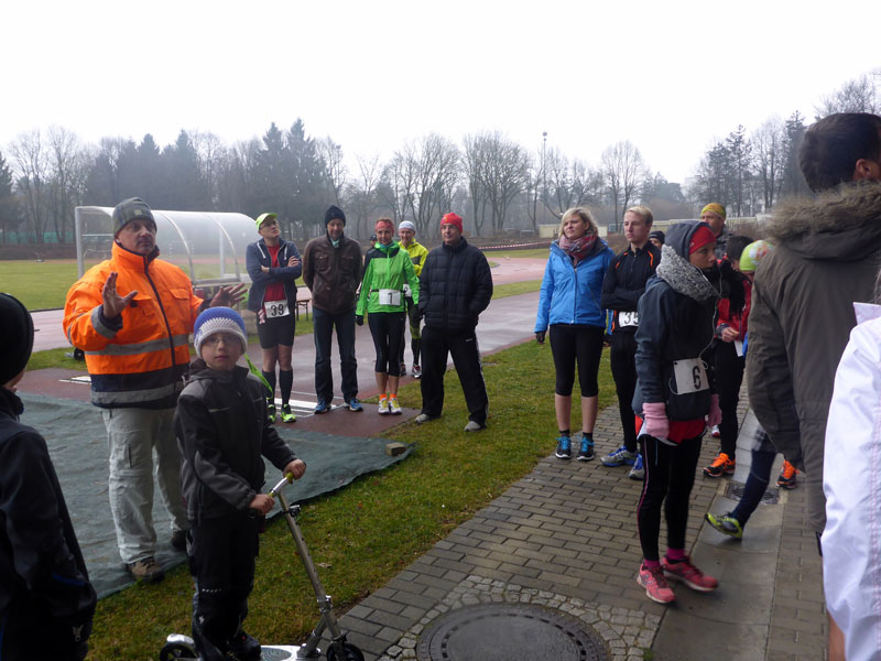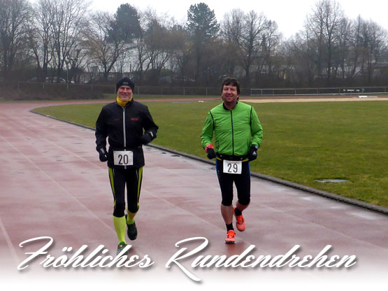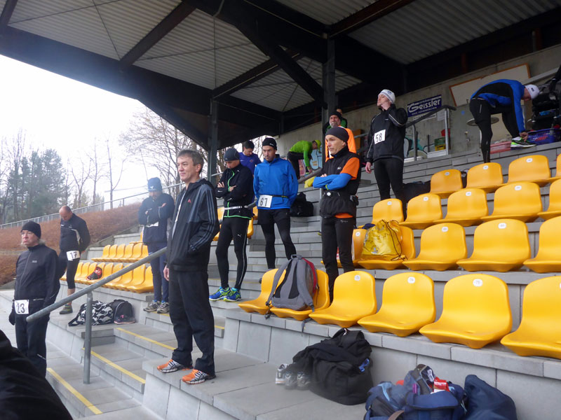 Zusammen mit Charly treffe ich pünktlich im Sportpark ein und wir holen uns wie immer erstmal die Startnummer. Dass es sich um eine sehr familiäre Veranstaltung handelt, merkt man hier sofort. Nicht nur das Ehepaar Rau ist sehr engagiert, auch die beiden Söhne und die Tochter sind mit dabei und hängen sich mächtig ins Zeug. Von der Tochter bekommen wir zunächst mal unsere Startnummern überreicht. Danach verziehen wir uns wieder in Charlys Bus. Dort ziehen wir uns um und lamentieren noch etwas darüber, auf was wir uns da wohl wieder eingelassen haben. Sechs Stunden im Kreis laufen. Draußen ist es kalt, diesig und feucht, nicht gerade das, was man unter idealem Laufwetter versteht. Ich wähle ein langes Laufunterhemd, ein Shirt und eine dünne Windjacke, es soll ja gegen Mittag wärmer werden. Wir begeben uns schließlich eine viertel Stunde vor Start in Stadion und lassen unsere Wechselklamotten im Auto. Ein Fehler, wie sich später herausstellen sollte.
