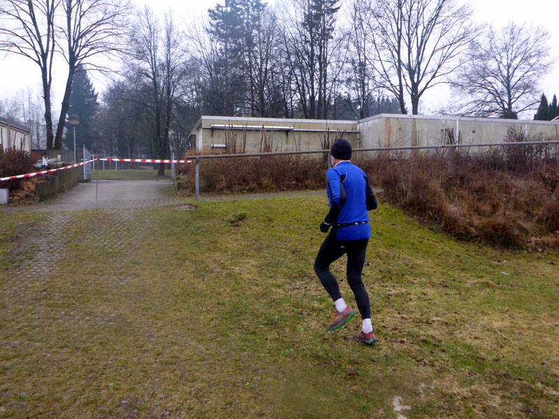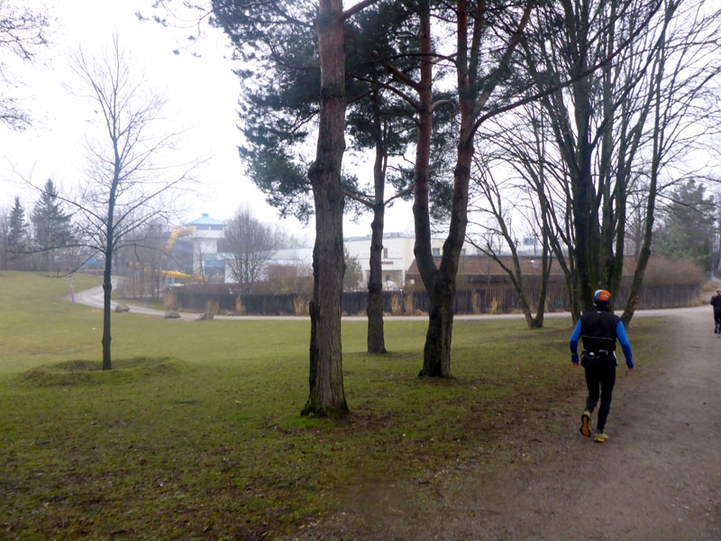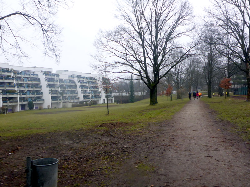 Im Stadion treffe ich noch kurz Dietmar Mücke, den meisten nur als Pumuckl bekannt. Er wohnt hier um die Ecke und unterstützt den Ottobrunner 6-Stunden-Lauf seit Jahren. Schließlich ruft uns Manfred zur Besprechung zusammen. Fast alle siebzig gemeldeten Läufer sind anwesend, aber Manfred ist dank einer kräftigen Stimme gut zu verstehen. Die Regeln sind ja auch einfach. Gestartet wird außerhalb des Stadions, sodass man nach gut 34 Runden die 50er Marke im Stadion erreicht, wo für diese Distanz die Zwischenzeit genommen wird. Pinkeln in freier Wildbahn ist ausdrücklich verboten. Wer dabei erwischt wird, wird – egal ob Männlein oder Weiblein – gnadenlos disqualifiziert. Fürs Geschäftliche gibt es Toiletten bei den Umkleiden im Stadion. Nachdem Manfred uns den Ablauf der nächsten sechs Stunden erklärt hat, spazieren wir gemeinsam zum Start. Es geht raus aus dem Stadion zu einem kleinen Park, schön zwischen mehreren älteren Wohnanlagen gelegen.
