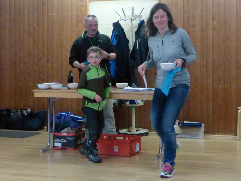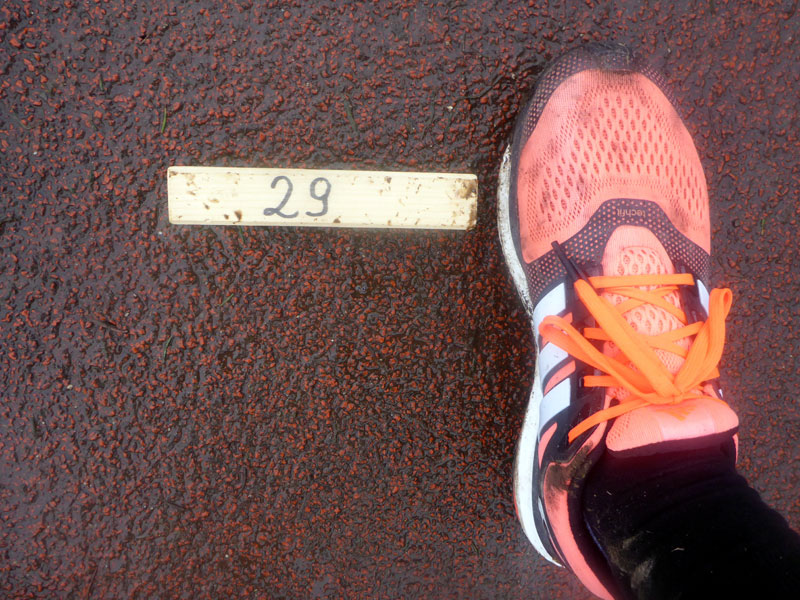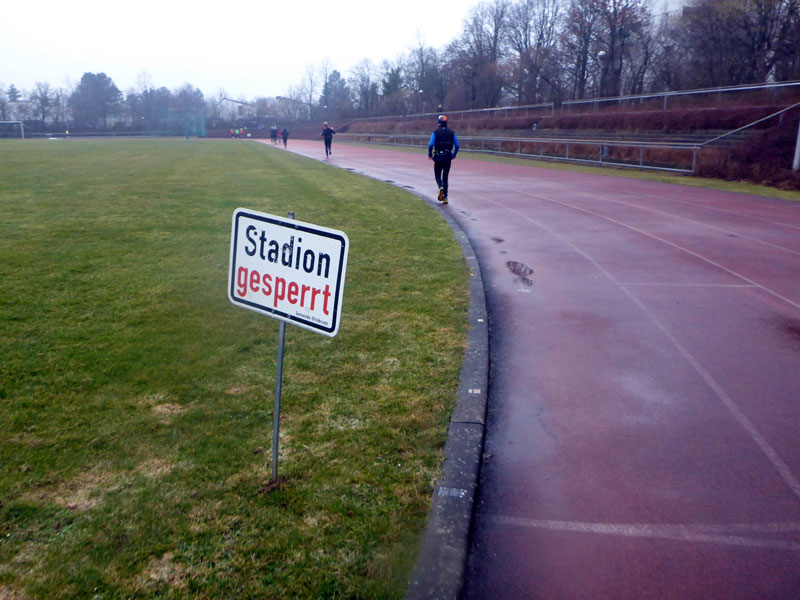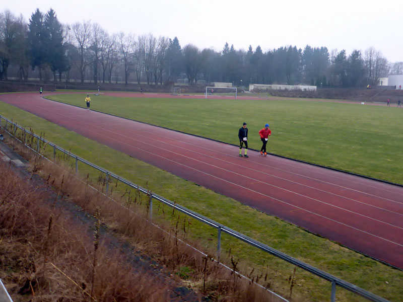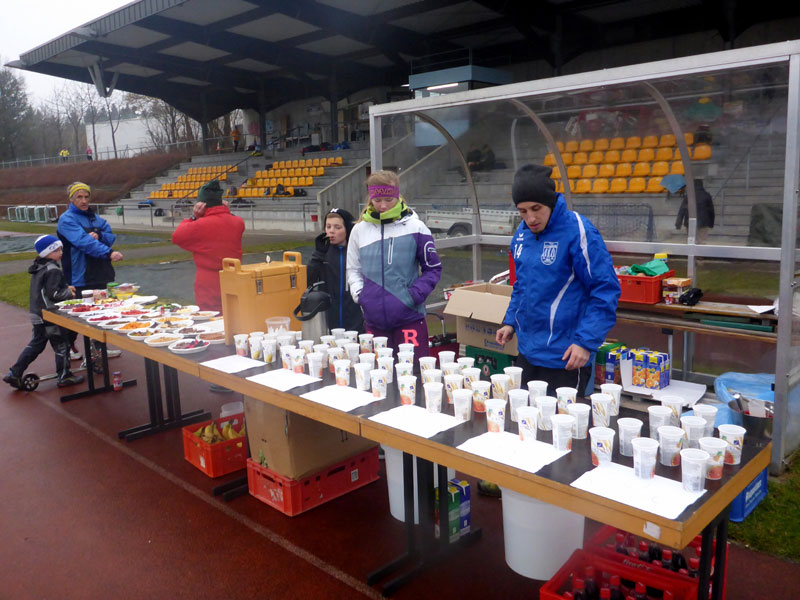 Manfreds Junior übernimmt für eine Runde die Führung und danach kennt sich jeder aus. Wir laufen durch die Wohnsiedlung im Park, wo es zu späterer Stunde ziemlich matschig wird, danach vorbei an ein paar Tennisplätzen, biegen danach in Richtung Stadion ab und drehen dort auf der Tartanbahn eine Runde. Auf der Start-Ziel-Geraden ist die Verpflegungsstation aufgebaut, die dem Büffet in einem Drei-Sterne-Hotel gleicht. Manche Teilnehmer haben auch eigene Verpflegungstische aufgebaut. Nach der Runde auf der Tartanbahn gibt es einen kleinen Anstieg. Hinter den Tribünenplätzen geht’s vorbei und an der Sprecherkabine, wo Angelika unermüdlich die Startnummern abliest und notiert. Zur Sicherheit sind zwei weitere Buchhalterinnen im Einsatz.