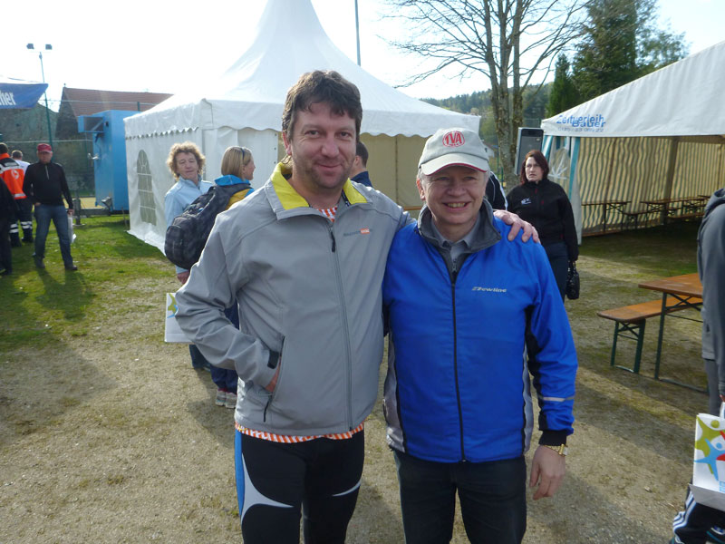 Dort erwartete mich eine Überraschung. Statt eines jungen hübschen Mädels hängt mir Bernie im Ziel die Medaille um. Er hat kurzentschlossen die Medaillenmädels abgelöst, da er ja eh auf mich warten wollte. Bei Bernie lief es heute super, wie er mir erklärte. Er hat eine super Zeit hingelegt und blieb auch während des gesamten Laufs beschwerdefrei. Auch Janosch ist gut durchgekommen und freute sich nun schon auf den Eintopf, den es im Zielbereich gab.