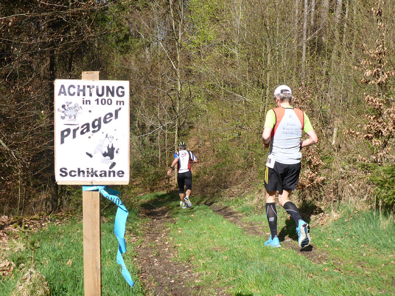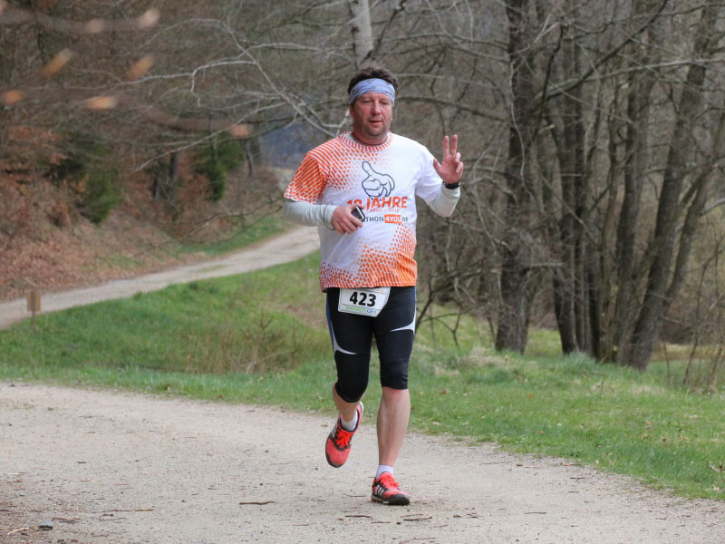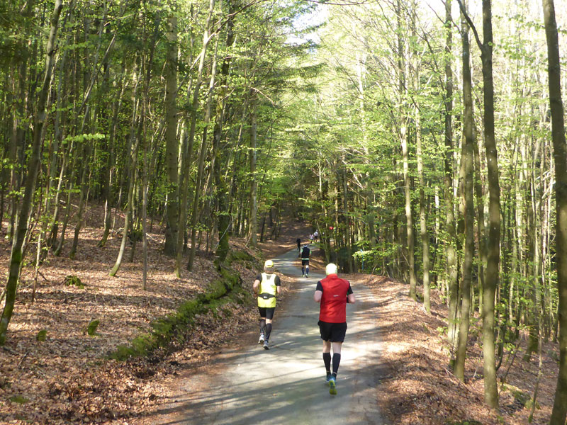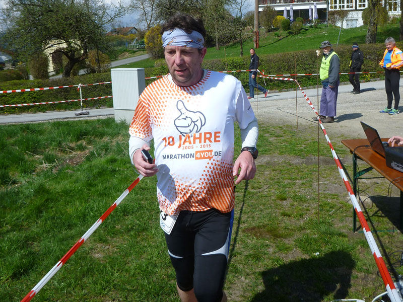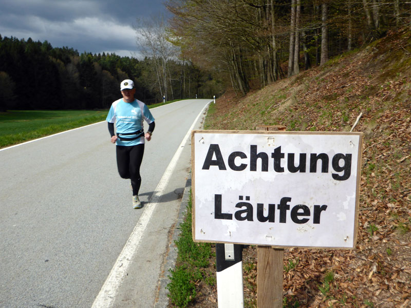 Ich freue mich nun auf die zweite Runde, stecke aber die Kamera weg, bis ich das Ziel erreiche. Weitere Mitläufer kann ich kaum fotografieren, denn ich bin völlig alleine unterwegs und landschaftlich wird sich in den nächsten zweieinhalb Stunden nicht viel tun. Irgendwann entdecke ich einen Läufer vor mir, wobei ich schon wieder kurz vor dem Dreiburgensee bin und kann ihn beim Dreiburgensee auch einholen. Es ist der Olaf aus Nürnberg. Er reiste gestern die 240 km mit dem Fahrrad aus Nürnberg an und hat zum Schluss etwas schwere Beine, was ich mir gut vorstellen kann. Nach einer kurzen Unterhaltung verabschiede ich mich und mach mich auf dem Weg in Richtung Ziel, das ich am Ende auch problemlos erreiche.