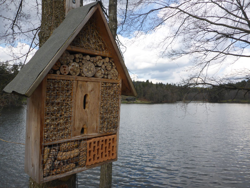 Das Ende dieses Streckenabschnitts kündigt sich mit dem Erreichen des „Museumsdorfs Bayerischer Wald“ an. Auf 25 Hektar kann man dort Gebäude aus der Zeit von 1580 bis 1850, wie sie für den Bayerischen Wald typisch waren, erkunden. Wir umrunden das Areal und unterqueren eine Staatsstraße und schon ist der Dreiburgensee erreicht. Ein Ausflugsziel für Familien, aber aufgrund des kühlen Wetters ist es dort heute noch ruhig. Auch hier gibt es bald wieder die nächste Verpflegung, die ich dankbar annehme. Die Umrundung des Dreiburgensees ist mit einer der schönsten Teile der Strecke. Ich genieße hier jeden Meter. Über einen Steg hinweg geht‘s in einem Waldstück schließlich wieder etwas bergan und anschließend auf einem Feldweg parallel zu einer Staatsstraße wieder zurück in Richtung Thurmansbang. Hier geht es an einem Weiher vorbei, an dem Bernie im letzten Jahr kurzentschlossen bei einem Junggesellenabschied stoppte und die Jungs um ein Bier erleichterte.