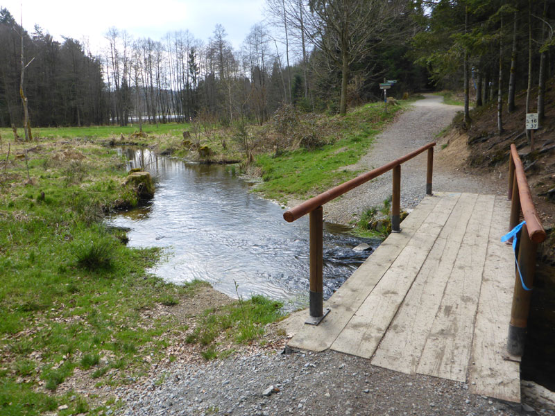 Auch diese Frage kann ich leider nicht beantworten, es ist aber so. Wir laufen nun auch wieder auf Teer, vorbei an einem riesen Schrottplatz, mit tausenden von Kfz-Leichen und danach links weg auf eine Staatsstraße, die sich permanent durch den Wald und ein paar Ortschaften schlängelt. Es geht auch permanent bergauf und bergab. Dieser Teil der Strecke zieht sich etwas, daran können auch die Hinweisschilder auf die drei Burgen, die der Region ihren Namen geben, nichts ändern. Dank der Hinweisschilder kann ich sie aber wenigstens in der Ferne erkennen, sonst wäre ich wohl achtlos daran vorbeigelaufen.