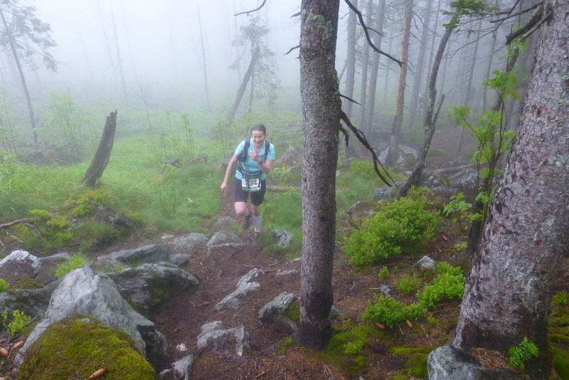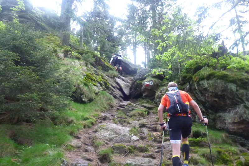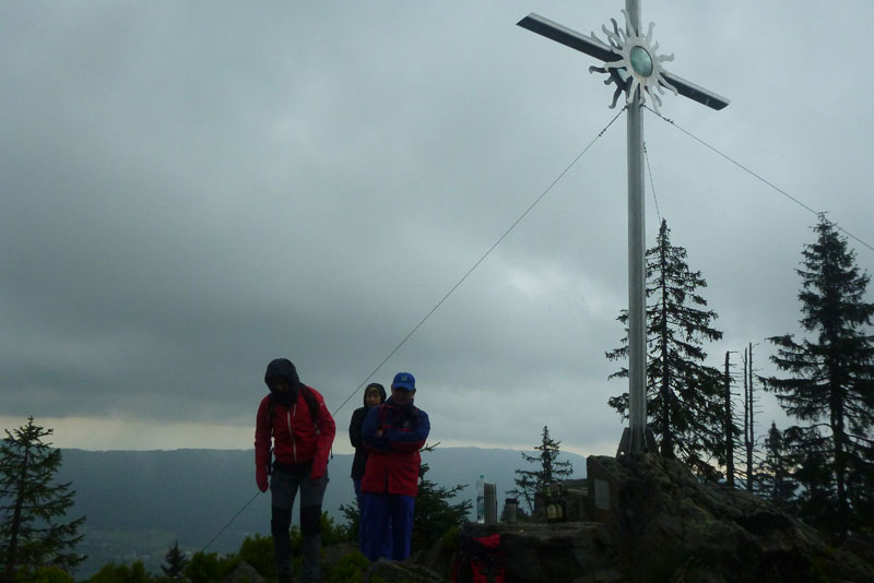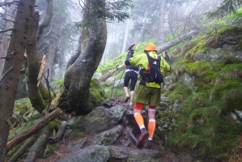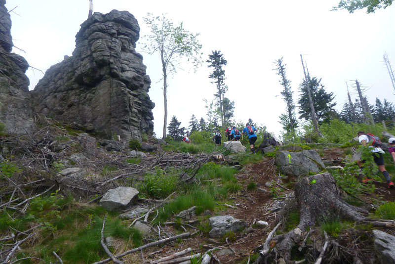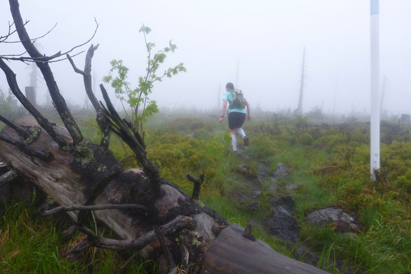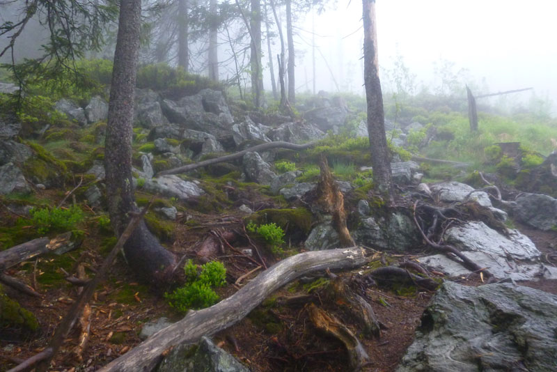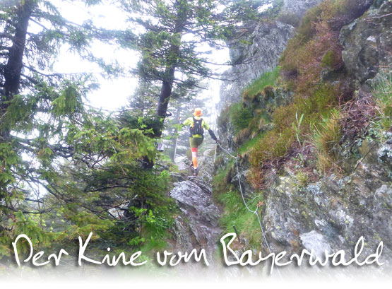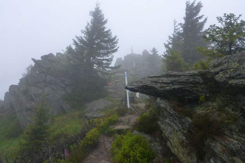 Ein steiniger urwüchsiger Steig, erfordert zwingend Aufmerksamkeit, ist aber doch deutlich entspannter als der vorhergehende Aufstieg. Witzbolde haben Anfeuerungen und lustige Sprüche an Baumstämme gepinnt. Schließlich erreichen wir über einen felsigen, mit Seilen gesicherten Steig, etwas unterhalb des Gipfels den Großen Osser (1293 m). Etwas oberhalb unserer Laufstrecke steht auf dem Plateau das Osser-Schutzhaus, hier verläuft auch wieder die deutsch-tschechische Staatsgrenze, genau in ein Meter Entfernung am Haus entlang. Im Nebel ist aber wenig bis nichts für uns davon erkennbar.