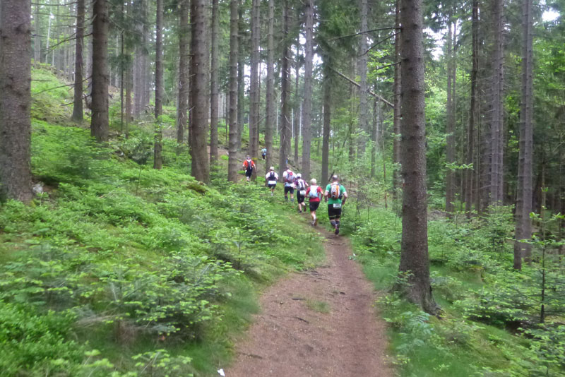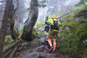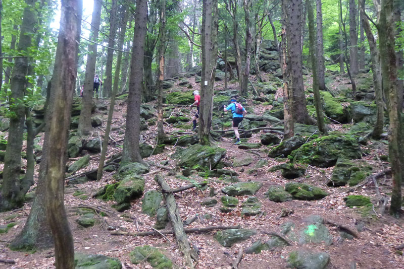 Nach 50 Minuten habe ich die etwa 700 Höhenmeter abwärts vernichtet, jetzt ist mir wieder wohlig warm, eigentlich viel zu warm in meiner Regenjacke. Aber es geht wieder bergwärts, oben ist wieder alles grau. Ich verzichtet darauf meine Jacke einzupacken. Bis zum Cut-Off an V3 liegen etwa 4 km vor mir. Der Aufstieg bis zur Labestelle ist nicht sonderlich anspruchsvoll, der Großteil verläuft auf Waldwegen oder breiteren Trails.