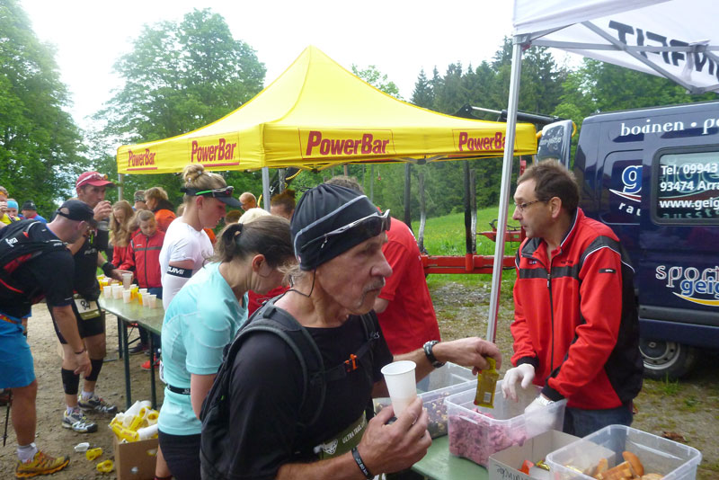 Ein kurzer Abstieg und wir erreichen V4 bei Km 45. Neben dem jetzt schon gewohnt großen Angebot, kann man hier auch ein alkoholfreies Bierchen zwitschern. Die Helfer sind trotz des bescheidenen Wetters allesamt gut drauf und strahlen eine richtige Begeisterung aus.