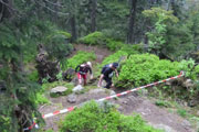 Der Aufstieg zum Zwercheck ist ein einziges Abenteuer, der stark verwurzelte und verblockte Pfad bietet uns allerhöchste Schwierigkeitsgrade, die Steine sind durch die Nässe sehr mit Vorsicht zu genießen. Nach etwa zwei Kilometer feinster Trail-Session erreichen wir den böhmischen Grenzkamm am ehemaligen "Eisernen Vorhang" und nun EU-Außengrenze. Heute arbeitet man aber zusammen, an dem grenzüberschreitenden Aktionsbündnis „Künisches Gebirge“ das sich zwischen Zwercheck und Osser erstreckt, haben sich 5 bayerische und 6 tschechische Gemeinden zusammengeschlossen.