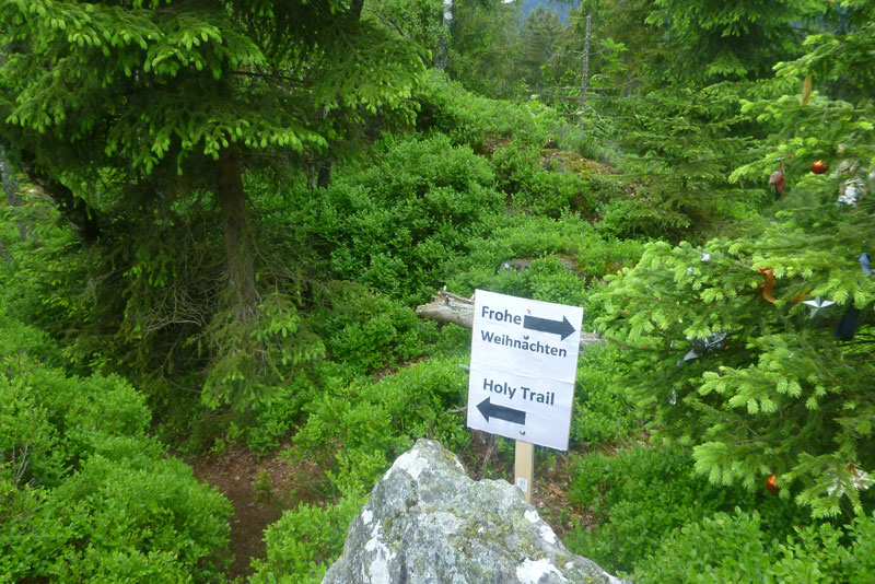 Etwa drei Kilometer vor dem Ziel geht es auf den „Holy-Trail”, eine wunderschöne, sehr anspruchsvolle Trailpassage. Es geht schön wellig über Felsen und mitten durch Büsche auf meist ganz weichen Waldboden. Für die geschundenen Füße ein heiliger Ort, für meine Bein-Muskulatur aber eher schwierig, für mich leider nicht mehr in höherem Tempo zu bewältigen. Nach einem „Frohe Weihnacht“-Schild passieren wir doch glatt noch einen geschmückten Tannenbaum.
