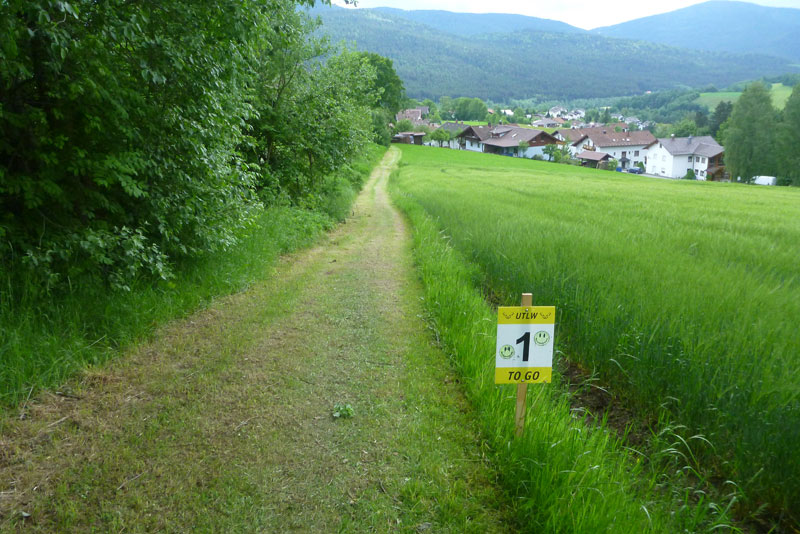 Dann geht es raus aus dem Wald und Lam liegt uns zu Füßen. Außergewöhnlich angenehm sind die beiden Schlusskilometer, über Wiesen geht es ausschließlich leicht abwärts bis in die Ortsmitte zum Zieleinlauf, auf dem man uns noch einen roten Teppich ausgerollt hat. Ein großartiger Abschluss für einen außergewöhnlich schönen Trail. Außergewöhnlich ist auch das „Trailwasser“ Finishergeschenk. Was ich natürlich nie kosten werde, da es einen Ehrenplatz in der Medaillensammlung bekommt.