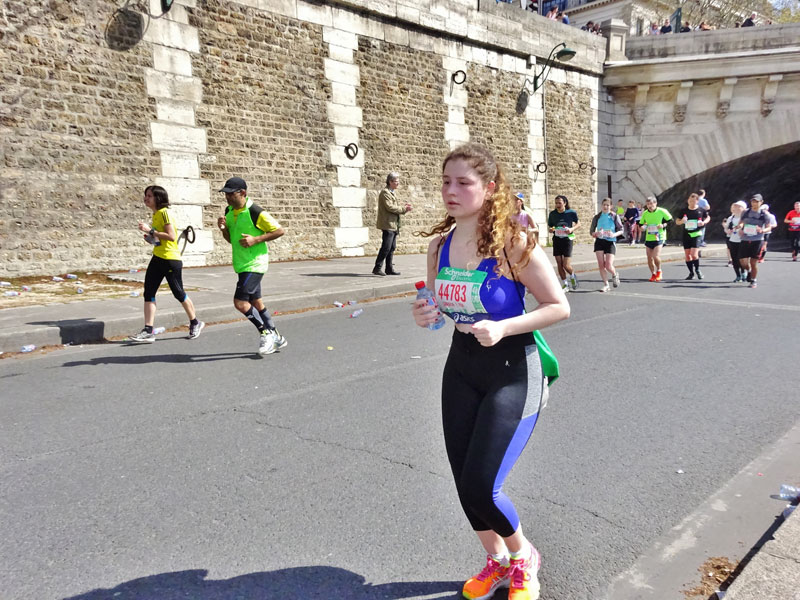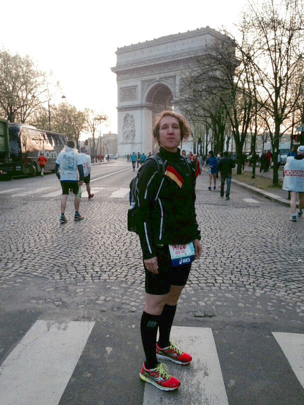 Judith lief wie ein Uhrwerk beflügelt ihre Strecke weiter, erst bei KM 24 konnten Gerhard und Sabine sie an der Seine endlich wieder anfeuern, sie war voll im selbst gesteckten Zeitlimit. Ich bin gleich weiter zu KM 35 in den Bois du Bologne; hier konnte ich Judith zum Glück im dichten Läuferfeld entdecken und freudestrahlend weiterwinken. Der andere Teil vom Fanclub ist inzwischen zum Zieleinlauf gefahren, um auch dort wieder unsere Judith in Empfang zu nehmen. Weltweit rangiert der Paris-Marathon auf Platz 8 der Liste der schnellsten Marathonveranstaltungen – kein Wunder also, dass Judith so Gas gegeben und ihr Vorhaben konsequent und bravourös umgesetzt hat.