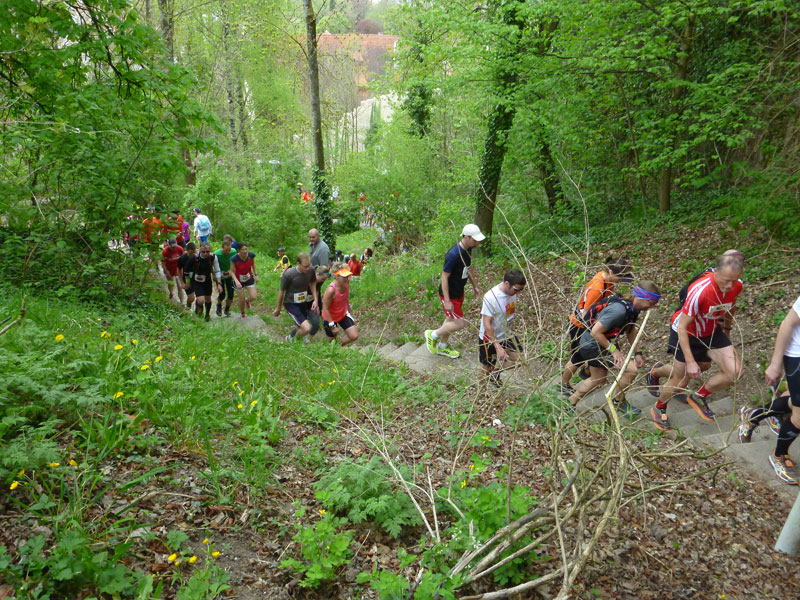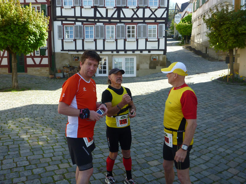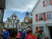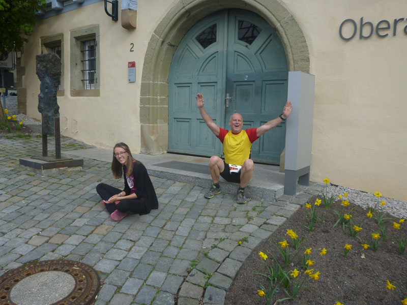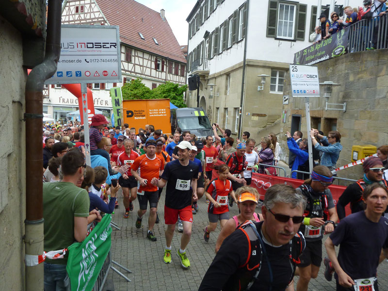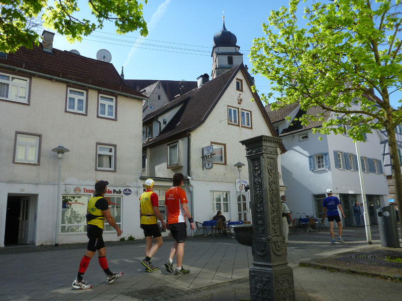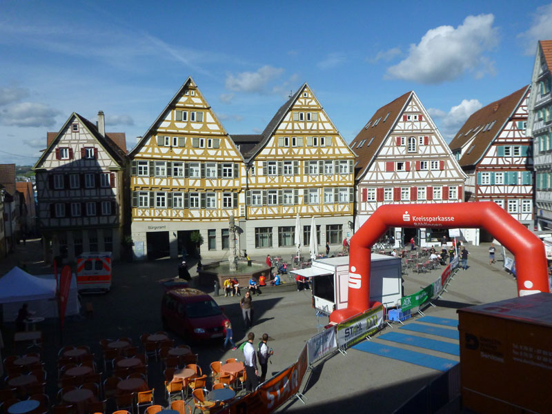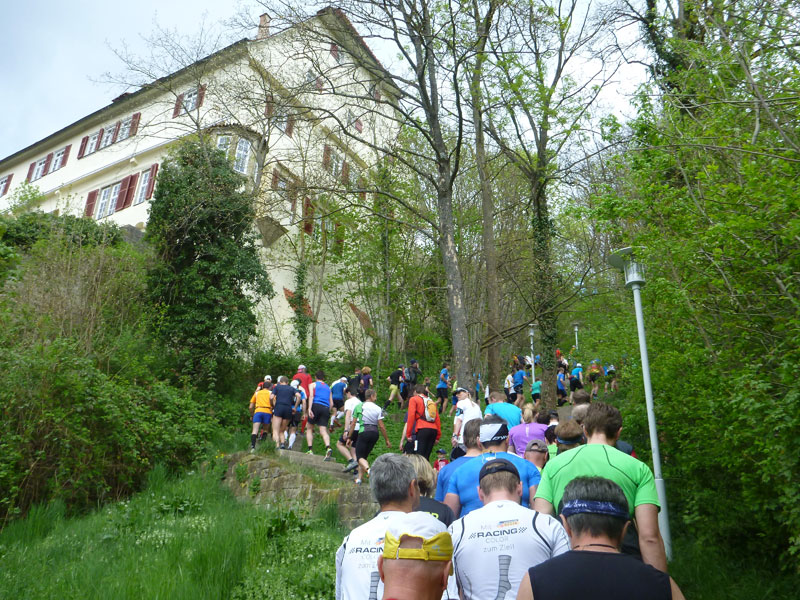 Bei Km 39 treffen wir wieder auf den ersten Teil des Kurses, auf fast identischem Weg geht es zurück ins Ziel. Ein letzter, aber äußerst giftiger, kurzer Anstieg auf den Schlossberg, oberhalb der Hausgrenze von Herrenberg bei Km 41 km kann bei mir und wahrscheinlich bei den meisten anderen auch, keine Jubelarie mehr hervorlocken. Vom Schlossberg hinunter führen uns wieder die berühmten Staffeln, es geht direkt an der Herrenberger Stiftskirche vorbei. Der Schlossberg ist hier nicht ganz stabil. Jährlich wandert die Kirche um einen Millimeter auf die Altstadt zu.