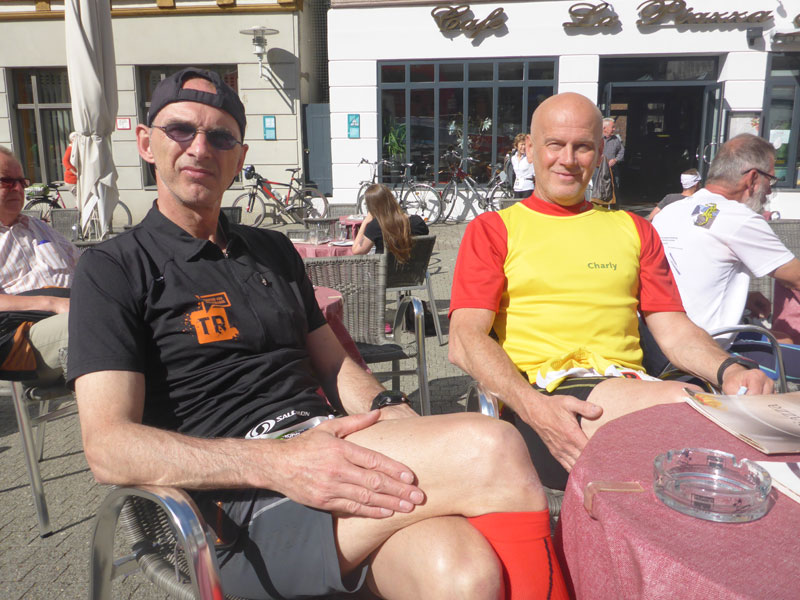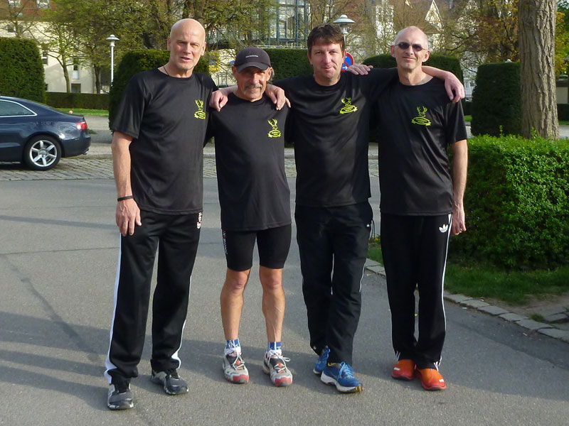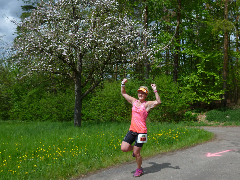 Der letzte Kilometer zieht sich scheinbar endlos dahin, das kommt daher weil bei hier nach 42,2 km noch nicht Schluss ist, wir müssen noch einige hundert Meter drauf legen bis zum Zielbogen. In die letzte Kurve vor dem Ziel auf dem Marktplatz werde ich mit einer La Ola geschickt, wo ich vom Zielsprecher empfangen werde. Viel hat er jetzt nicht mehr zu tun, nur noch spärlich tröpfeln Finisher ein. Nach 5:18 Stunden bin ich im Ziel, das Zeitlimit ist auf 6:30 h festgelegt, das müsste für die meisten ohne Stress zu bewältigen sein. Die Zielverpflegung bietet nochmals reichlich Möglichkeit verlorene Energien aufzufrischen. Mittlerweile sind ein paar Wolken aufgezogen und ich bin froh, mir gleich meine um die Ecke deponierte Jacke überziehen zu können.