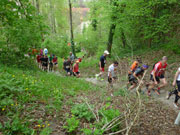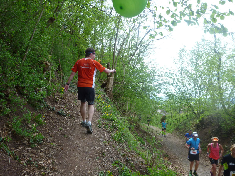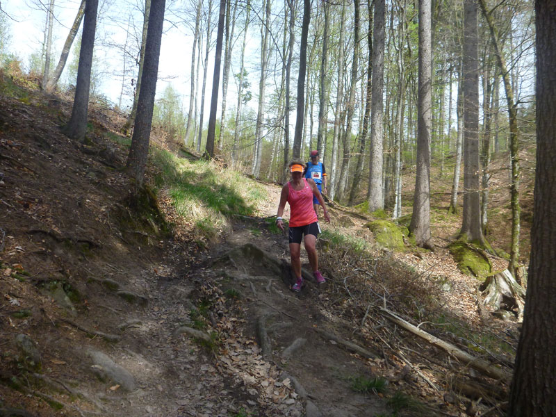 Nach der kurzen Erholungspause müssen wir über die Neue Weinsteige wieder zwei Kilometer aufwärts. Mir ist es zu kraftaufwändig und marschiere lieber. Kati ist gerade gut drauf und nimmt größere Abschnitte im Laufschritt und kann so von hinten wieder aufschließen. Meine stellenweise trabenden Kontrahenten in Sichtweite vor mir, machen hier aber laufend nicht viel Zeit gut. Meist rächt es sich ob des Kräfteverschleißes später sogar wieder, daher lasse ich es sein. Endlich wird die Strecke wieder abwechslungsreicher. Ein weiblicher Streckenposten schickt uns mit Vorwarnung über einen äußerst rustikalen Trail, mir gefällt das außerordentlich gut, während Kati darüber jammert. So unterschiedlich sind die Meinungen.