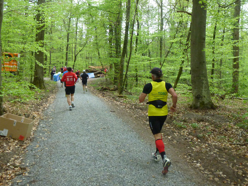Nach einem kräftigen Aufstieg erfolgt ziemlich genau nach 6 Kilometern die Streckentrennung vom T12, während sich die Kurzstreckler auf den Rückweg machen, geht es für uns wieder abwärts bis Mönchberg (Km 8,5). Am Ortsrand ist die zweite Getränkestation eingerichtet. Im weiteren Angebot des Veranstalters stehen auch eine 2-er und 4-er Staffel, für die hier ihr erster Wechsel erfolgt.