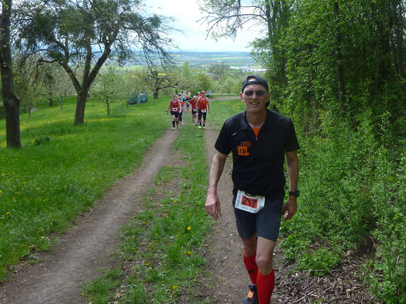 Zur Auflockerung wechseln wir aber zwischendrin auch wieder auf eine kurze Trailpassage. Die Pfade sind aufgrund der längeren Trockenheit ziemlich ruppig und staubig und erfordern deshalb einige Aufmerksamkeit. Trailschuhe bräuchte es bei der heutigen Wetterlage nicht zwingend auf der Strecke, der Boden ist dermaßen trocken, sodass wir nur sehr selten auf weichere Untergründe treffen. Über eine Zeitmessmatte erreichen wir bei Km 17,5 km am Sportplatz Entringen die nächste Versorgungsstation und Wechselpunkt für die Staffeln.