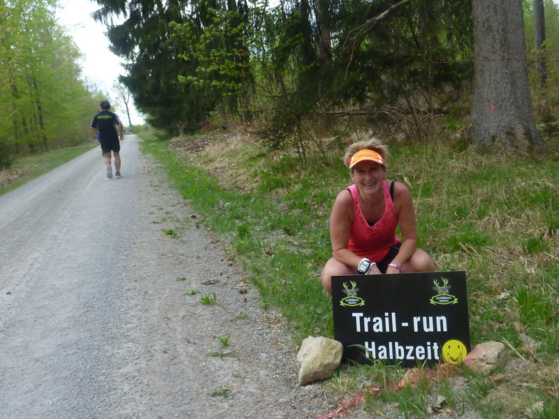 Unser Rückweg führt uns wieder auf die wenig abwechslungsreiche Waldautobahn Kayher Straße, hier passieren wir auch die Halbmarathonmarke. Kati posiert für ein Bildchen und weiter geht’s. Wenig später biegen wir an der nächsten Labe nach rechts in die Weinsteige ab und es wartet ein zwei Kilometer langer Downhill auf uns, wo es immer noch auf Schotter, 80 Höhenmeter abwärts zu vernichten gibt.