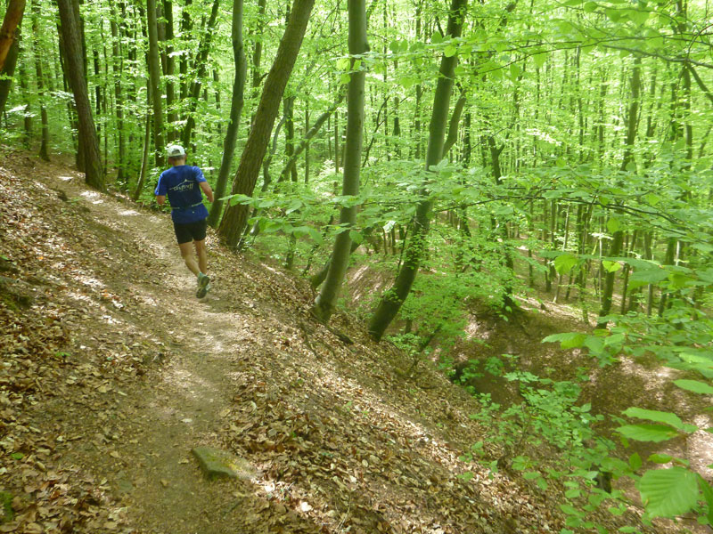 Auf den letzten 20 Kilometern wechselten sich kürzere Trailpassagen mit längeren Waldwegabschnitten ab. Am Schild wo uns noch 10 km bis zum Ziel angezeigt werden, dreht sich das Verhältnis zugunsten natürlicherer Untergründe. Über überwiegend schmale Naturpfade geht es jetzt durch den hohen Baumbestand des Schönbuchs, teilweise an abenteuerlichen Abhängen mit tiefen Schluchten entlang. Dabei gibt es auch einige interessante Hindernisse, wie Flussüberquerungen und umgefallene Bäume zu überwinden. Die Kilometerbeschilderungen beschränken sich, wie auf Trails durchaus nicht unüblich, auf das nötigste. Die Schlusskilometer werden jetzt aber in immer kürzer werdenden Abständen angezeigt.