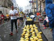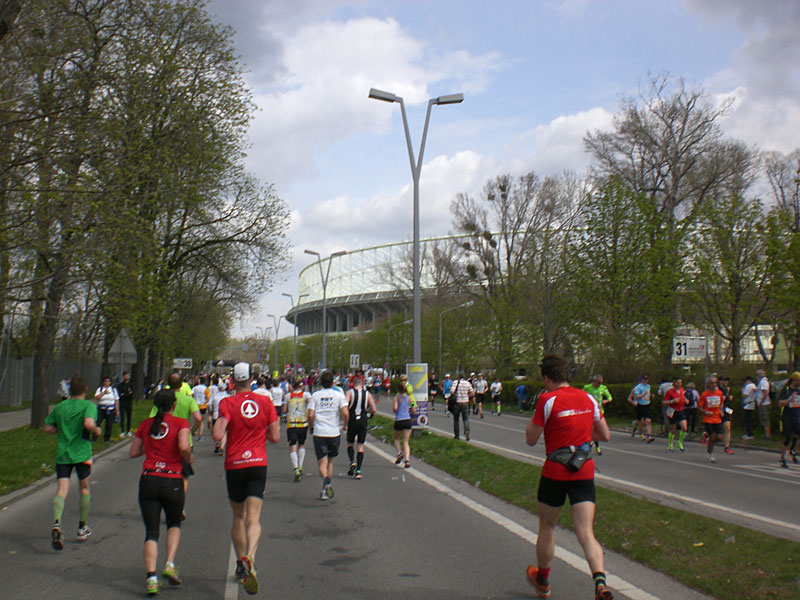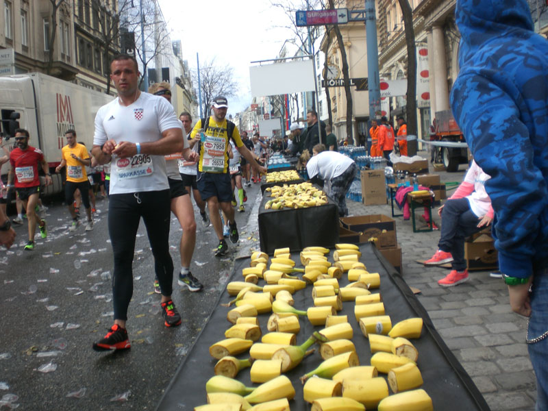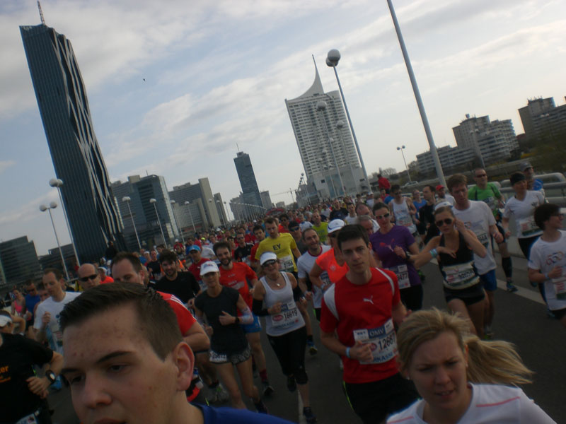 Am Ernst-Happel-Stadion traf ich meine Herbergsmutter Franziska, bei der ich liebend gerne mein Langarmunterhemd abgab. Mittlerweile wurde es ganz schön warm und ich war immer froh an den Labestellen nach Wasser und Isotonischer Erfrischung greifen zu können. Der aufkommende, warme Wind blies dazu auch noch stellenweise unangenehm ins Gesicht, so dass das Laufen nicht mehr so einfach war. So habe ich mein Lauftempo ab ca. Km 32 reduziert, um nicht wie einige andere am Straßenrand von Sanitätern behandelt werden zu müssen.