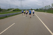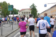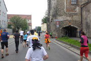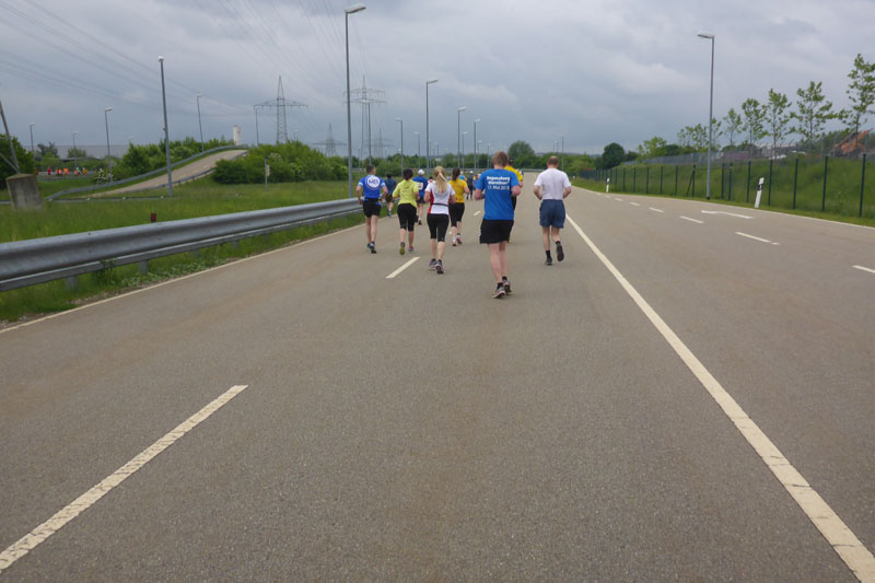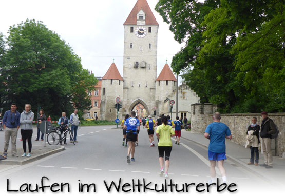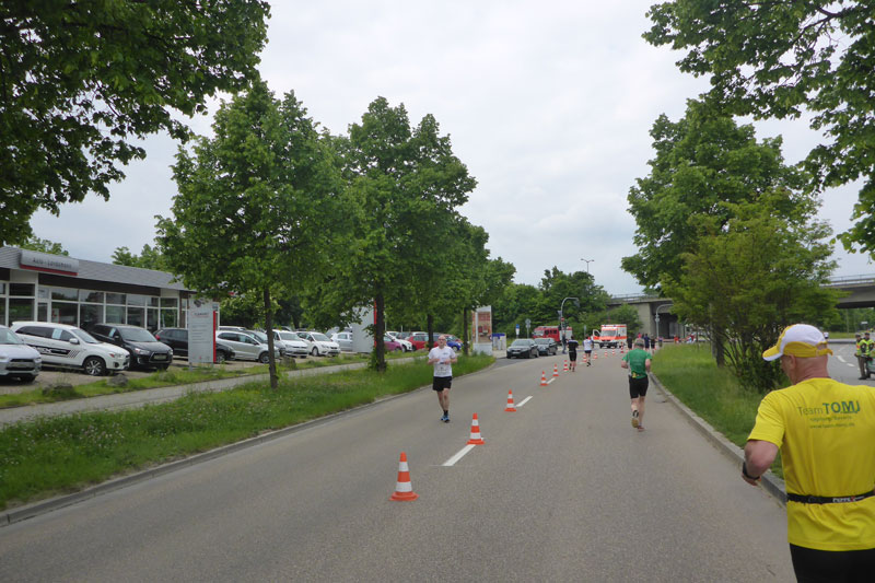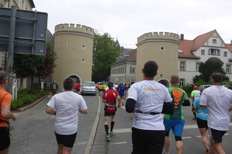 Nun hat es sich eigentlich auf der Hinrunde auch schon mit den Sehenswürdigkeiten, die Kilometer auf der Straubinger Straße runter, wo wir bei etwa Km 9 in die Siemensstraße abbiegen sind nicht besonders erwähnenswert und dienen eher zum Abschalten. Was uns dann kurz vor Km 11 erwartet, ist neu – zumindest mir noch nicht bekannt – und naja, wie soll ich sagen, eigentlich schon eine lustige Idee, aber mir hat`s halt einfach nicht gefallen. Wir laufen nun auf ein Betriebsgelände und werden mit einem festinstallierten Banner mit dem Aufdruck „Jetzt geht`s rund!“ begrüßt. Es ist der Continental Systemprüfkurs des gleichnamigen Reifenherstellers, der hier seine Reifentests auf einem rund anderthalb Kilometer langen, dreispurigen Kurs durchführt und wir durchlaufen die Teststrecke. Links säumen dicke Leitplanken die Strecke, doch was mich bzw. meine Knochen ziemlich negativ beansprucht, sind die höher gelegten Kurven. Es sind nicht wirklich Steilkurven, trotzdem ist der permanente Neigungswinkel in den drei Kurven deutlich spürbar. Am Ende der Teststrecke ist ein „Boxenstopp“ eingerichtet, an dem man sich verpflegen kann. Danach geht es über die Siemensstraße zurück zur Straubinger Straße und wir laufen bis Km 15 zurück zur Altstadt, die wir nochmals auf anderem Wege durchlaufen dürfen.