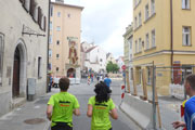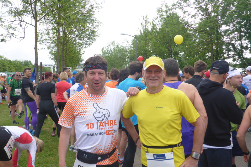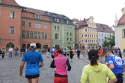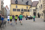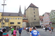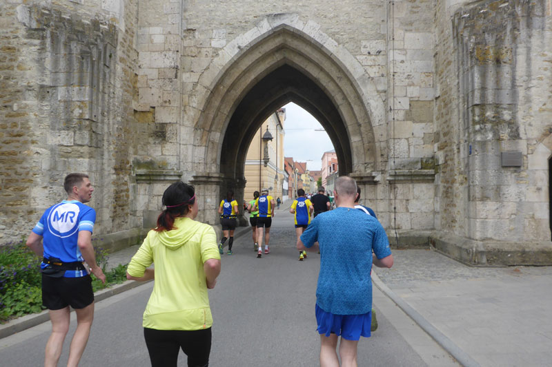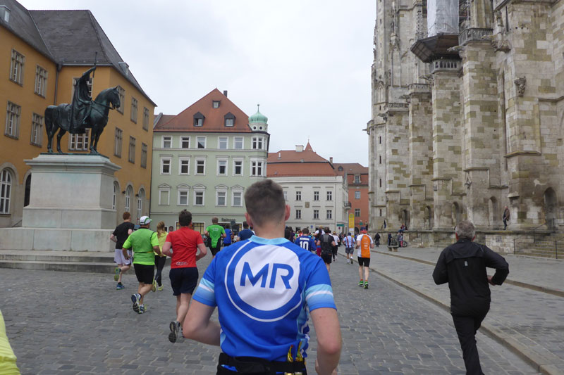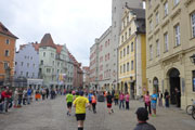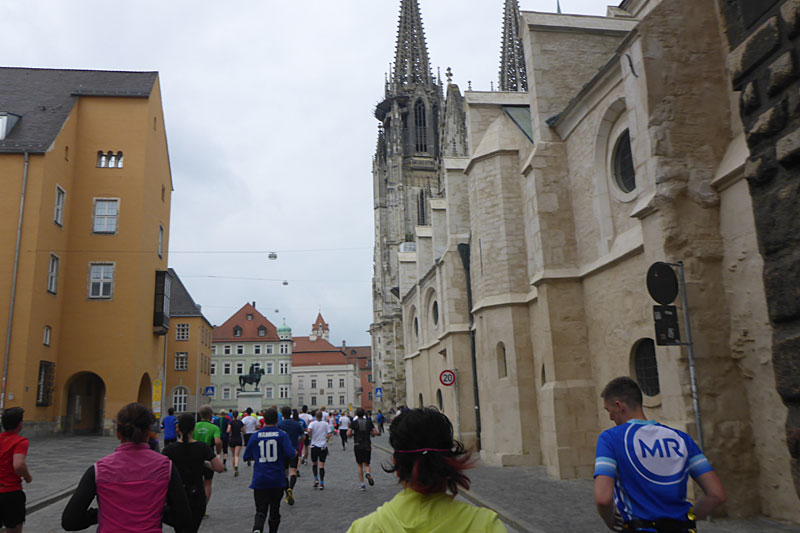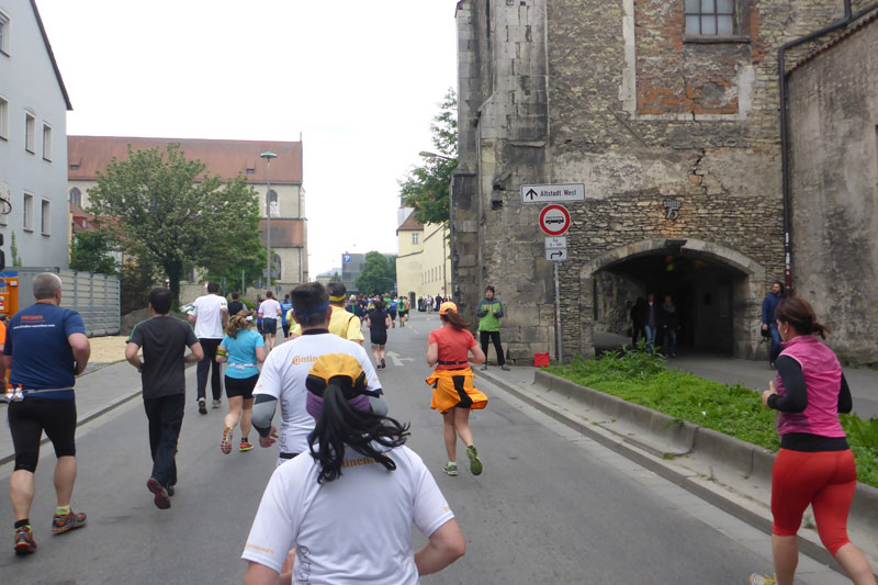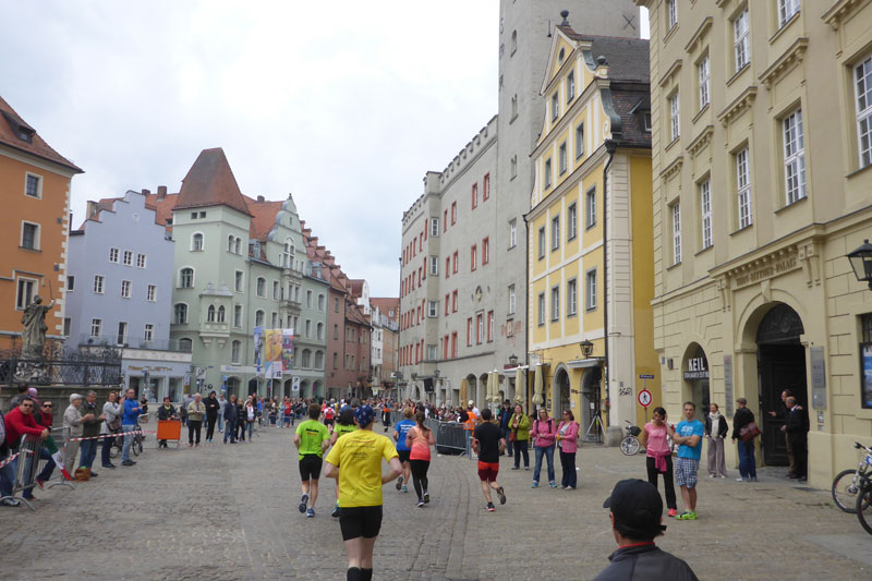 Aber irgendwann hatte ich auch diesen Teil hinter mir, die Straubinger Straße zurück hab ich im geistigen Tunnel verbracht und freute mich nun tierisch auf die Altstadt. Hier war inzwischen fast die Hölle los. Regensburger genossen die aufkommende Sonne in Straßenkaffees, Touristen versperrten schon mal die Ideallinie und auch die anwesenden Bands hatten noch nicht aufgehört zu spielen. Ich versuche die Balance auf dem Kopfsteinpflaster zu behalten, winke und grüße nur noch hier und da. Es lief nun richtig gut. Die Altstadt in Regensburg, ich weiß nicht, ob ich`s schon erwähnt habe, ist ein Traum und hier läuft`s, denn die Zuschauer und sonstig zufälligen Anwesenden tun einem mit ihrem Applaus richtig gut. Dann kommen die letzten drei bis vier Kilometer bis ins Ziel. Ein paar hundert Meter vor dem Ziel steht schon Charly, der mal wieder in einer tollen Zeit unter vier Stunden gefinisht hat und winkt mir zu. Ich laufe ins Ziel ein, bin happy da zu sein und bin auch erst mal platt.