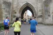 Am Ende des Ostenstraße geht`s rechts rüber zur Thundorfer Straße und wir laufen ein gutes Stück an der Donau entlang. Schiffe liegen hier vor Anker und Regensburg zeigt sich wieder von der schöneren Seite. Bei Km 17 haben wir die Steinerne Brücke erreicht, die wir nicht überlaufen, sonder wir lassen sie einfach rechts liegen. Seit meinem letzten Besuch von vor etwa einem Jahr hat sich hier auch etwas getan, denn die Steinerne Brücke ist komplett eingehüllt und wird offensichtlich renoviert. Da wir eh nicht drüber dürfen, ist mir das aber dann doch egal und wir nähern uns schön langsam aber sicher dem Ende der ersten Runde. An der Holzländerstraße erhalten die Halbmarathonis ihre letzte Verpflegung und ich merke auch, wie das Tempo um mich herum deutlich angezogen wird. Ganz kann ich es nicht vermeiden mitzuziehen, aber ich halte mich im Zaum, liegt doch die ganze Runde nochmal vor mir. So biege ich kurz nach dem Westbad nach links ab, während die Halbmarathonis nach rechts geleitet werde und nach rund zweihundert Metern im Ziel sind.