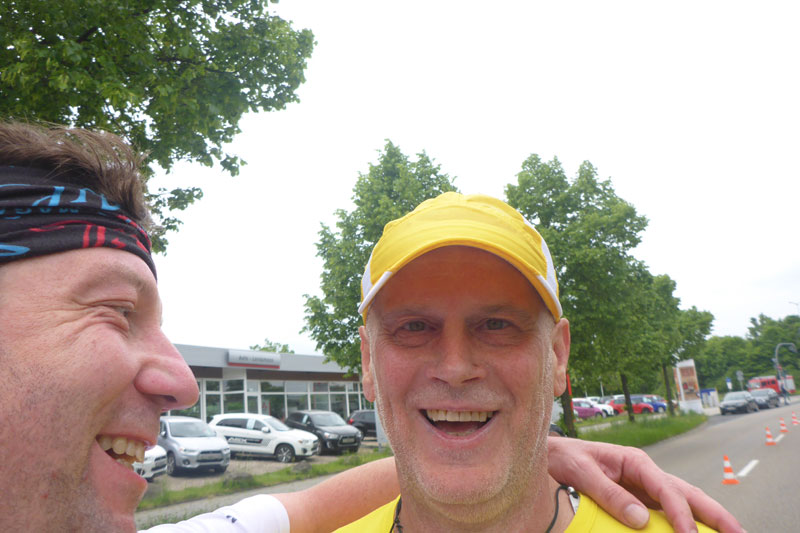 Erst mal genieße ich die Ruhe, die mich plötzlich umgibt, denn plötzlich bin ich nahezu alleine. Die vereinzelten Zuschauer in diesem Bereich zollen einem Applaus und Respekt, der mir gut tut. Die Ruhe hält aber nur bis zur Altstadt an, denn Dank des immer besser werdenden Wetters finden sich auch immer mehr Menschen in der Altstadt ein und die feiern wirklich jeden einzelnen Marathonläufer. Ich versuche mich bei allen Zuschauern für ihren Applaus zu bedanken, was mir nicht immer gelingt, denn es sind einfach zu viele. Als ich die Altstadt hinter mir habe, was ein wirklicher Genuss war, wartet die endlos scheinende Straubinger Straße auf mich. Ich laufe auf eine Mitläuferin auf, grüße höflich und sie sieht mich nur an und meint: „Were to hell are all the others?“. Eine englische Mitläuferin hat sich wohl auch ins Feld verirrt und ich entgegne ihr nur: „I think, they`re all behind us“. Sie lächelt und wir laufen weiter. Wir rollen aber beide den einen oder andren Marathoni auf und nähern uns wieder meiner geliebten Continental-Teststrecke. Kurz davon treffe ich noch auf Charly, der mir entgegenkommt, ein fast verunglücktes Selfie und unsere Wege trennen sich wieder. Der Gripp meiner Schuhe auf der Teststrecke war ideal, dennoch verfluchte ich weiter die „Steilkurven“, taten sie doch nun schon ordentlich weh.