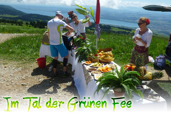 Kurz bevor der höchste Punkt des Aufstiegs erreicht ist, lichtet sich der Wald und präsentiert uns erste Einblicke in ein monumentales Amphitheater. Der Creux du Van ist ein riesiger, natürlicher Felsgürtel, rund 200 Meter fallen die Felsen in die Tiefe und bilden einen hufeisenförmigen Kessel von einem Kilometer Durchmesser. Die „Grüne Fee“ begrüßt uns kurz vor Erreichen des Plateaus, wo nach 14 km die zweite Verpflegungsstelle aufgebaut ist. Am VP „Le Solitat“ wird uns ein tolles Frühstück mit allem, was das Herz begehrt, auf einem unglaublichen schönen Aussichtspunkt in 1400 Meter Höhe serviert.