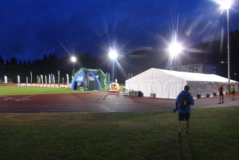 Die Nacht wird laut, es gibt ein heftiges Gewitter und starken Platzregen. Aber kurz vor dem Start werden die Himmelsschleusen wieder geschlossen und die Temperaturen sind angenehm runtergekühlt. Jan und ich stehen um 5:10 Uhr an der Kontrollstelle der Pflichtausrüstung. Zwingend vorgeschrieben sind eine Regenjacke, Rettungsdecke, Trillerpfeife, Mobiltelefon, mindestens 0,75 Liter Getränk und ein eigener Trinkbecher. Ich bin wie immer gut ausgestattet und habe noch etwas wärmende Kleidung im Rucksack. Akribisch kontrolliert werden Regenjacke und Handy. Oh shit, Jan hat seines versehentlich im 1,5 km entfernten Hotel liegen gelassen. Es gibt keinen Start ohne Mobiltelefon für ihn. Muriel spricht mit den Zeitnehmern. Ausnahmsweise dürfen wir dem Feld hinterherlaufen.