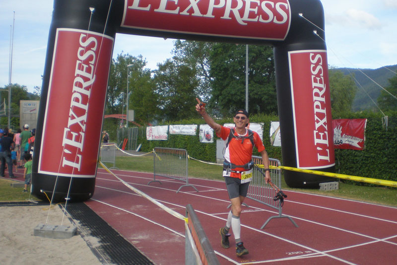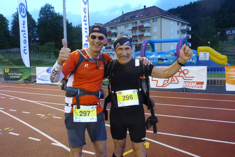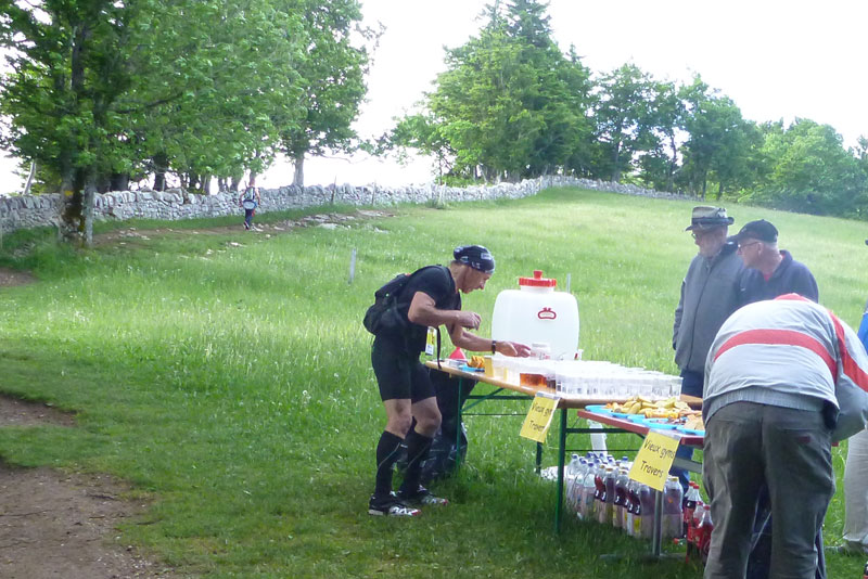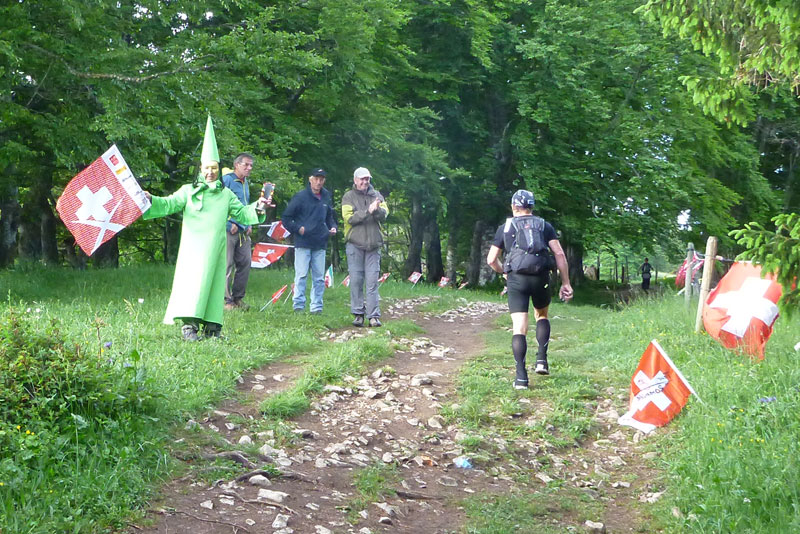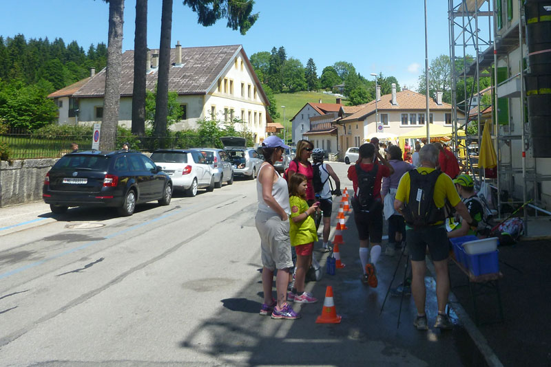 In Noiraigue wartet die erste Verpflegungsstelle bei Km 9 auf uns, durch ein Spalier von Finishershirts der 19 vorhergegangenen Veranstaltungen werden wir empfangen. Insgesamt 9 Versorgungsstationen sind auf der Traildistanz eingerichtet. Anders als bei vielen anderen Trails setzt man hier nicht auf das Prinzip der Selbstversorgung, sondern will eine ausreichende Flüssigkeitszufuhr und Nahrungsaufnahme gewährleisten. Mit einer gefüllten Flasche kommt man so gut von Station zu Station.