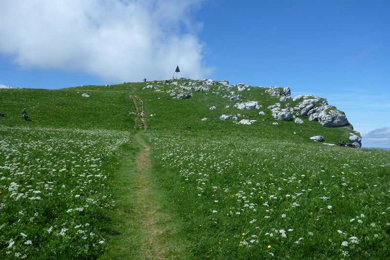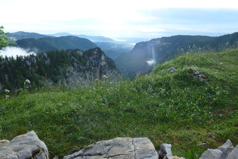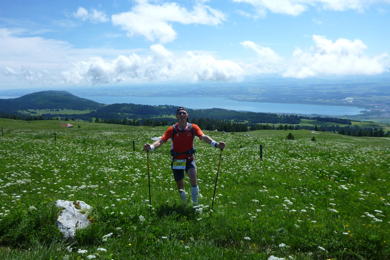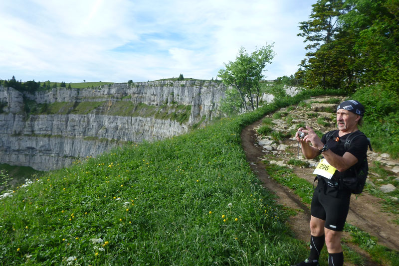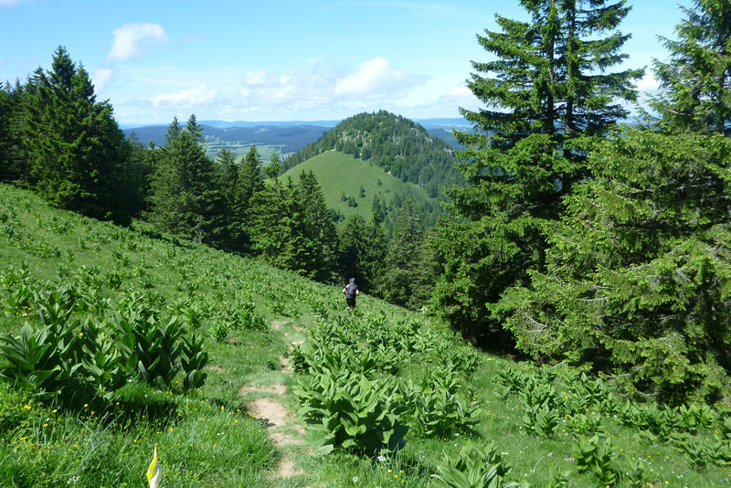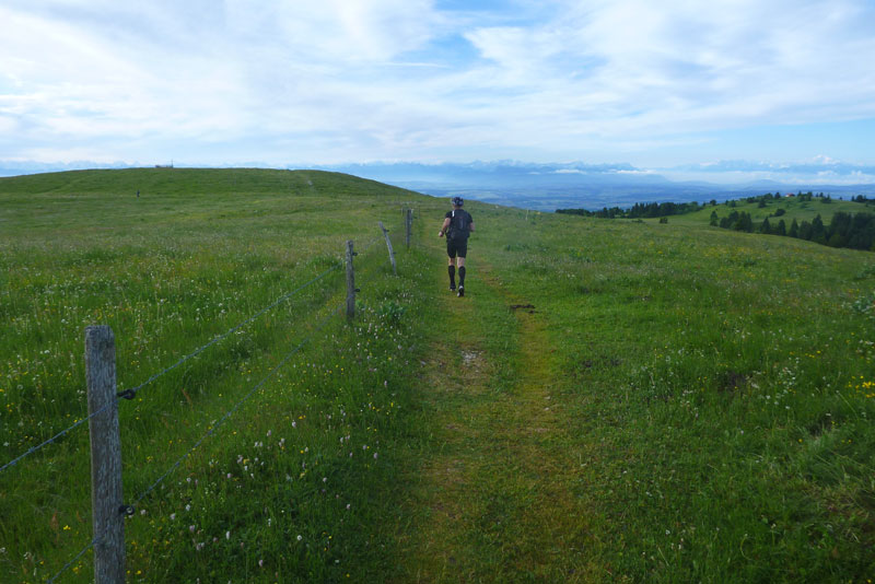 Die Naturarena ist das Resultat hartnäckiger Erosion durch Wasser und Eis über 200 Millionen Jahre, ganz unten im Talkessel sprudelt eine Quelle, die „fontaine froide“, deren Wasser das ganze Jahr über konstant 4 Grad kalt ist. Über fast 4 Kilometer kann man oben entlang der Kante laufen, über etwa die Hälfte verläuft die Laufstrecke. Aber die Show geht noch weiter. Über die weitläufigen Wiesenflächen der Hochebene wird uns eine grandiose Aussicht über das Schweizer Mittelland hinüber zu den Alpen geboten. Mont Blanc, Matterhorn und Eiger liegen vor uns, alles Orte, wo Trailrunner weitere Träume wahr machen können.